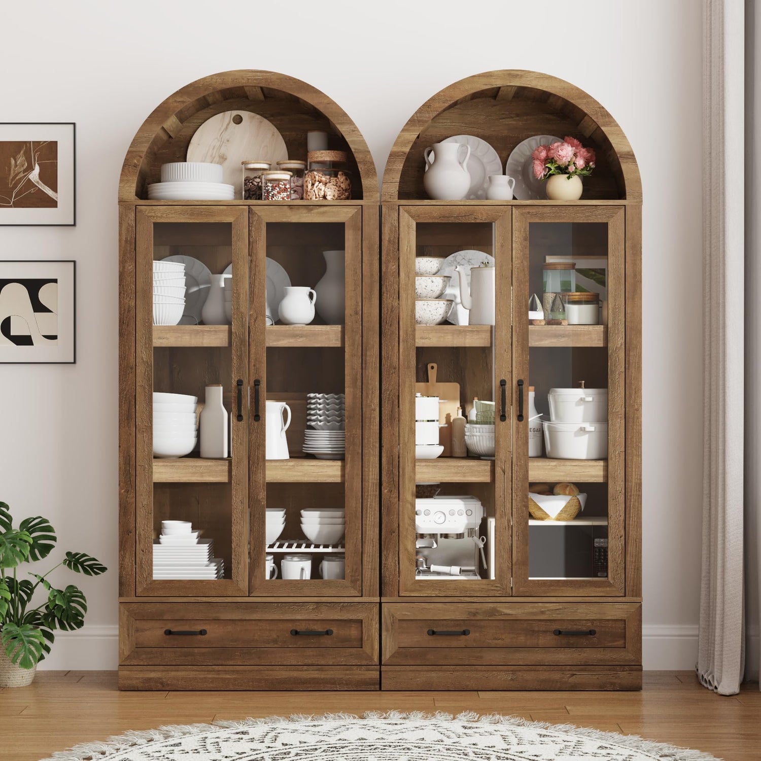 - Farmhouse Storage Cabinet for Living Room:Our tall storage cabinet featuring tempered glass doors, and antique board finishes to create a comfortable and rustic atmosphere.Matte iron-toned metal accents add a sophisticated edge, enhancing its overall visual. 75in high arch shape makes it a striking centerpiece in any room, Very suitable for placing books, figurines, decorations, etc.