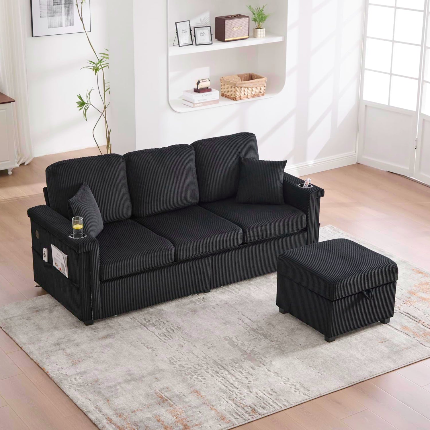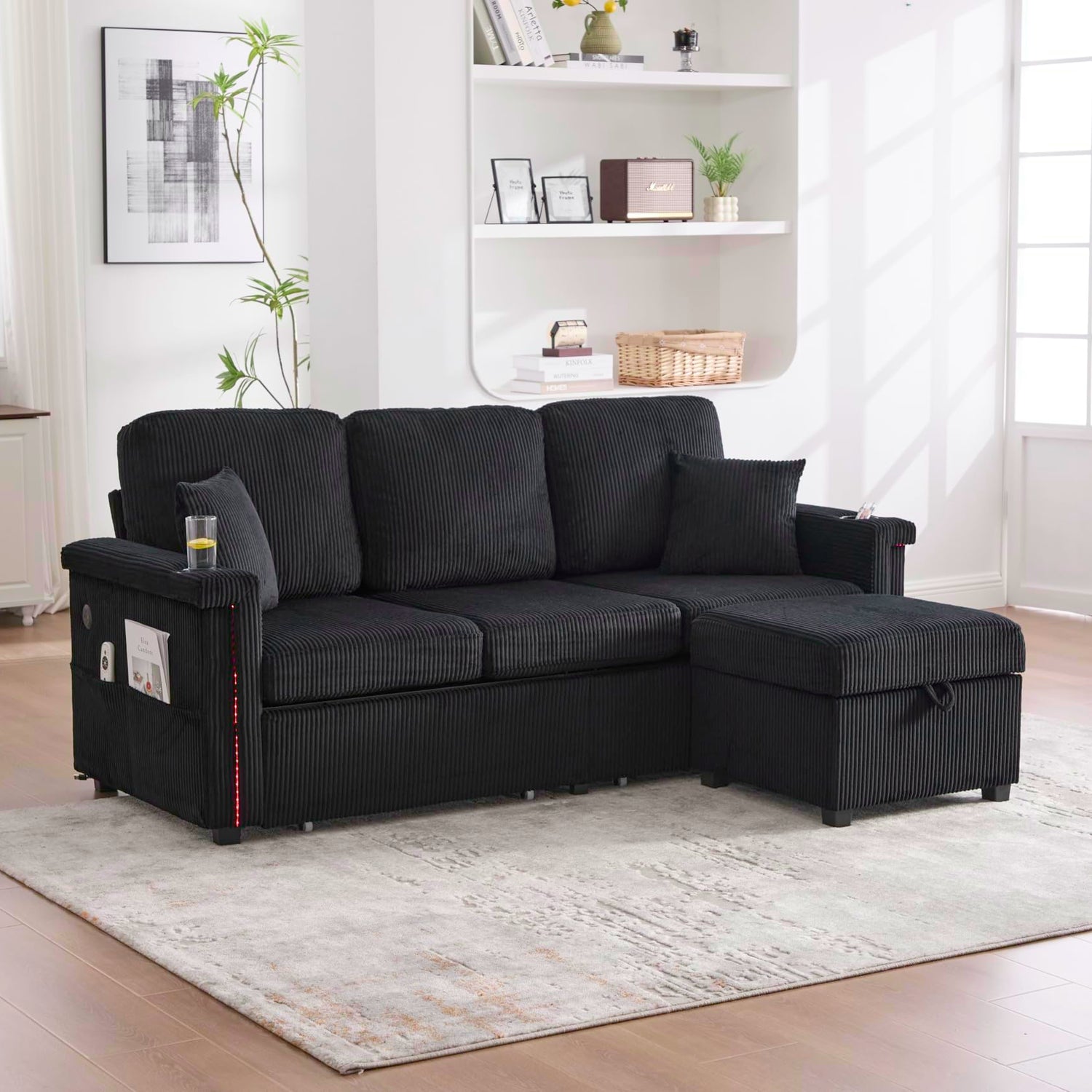 76.8" L-Shaped Sleeper Sofa with Storage Ottoman, USB Ports, Cup Holders&LED Lights, Side Pockets, Comfy Corduroy Modern 3-Seater Small Couch Bed for Living Room with 2 Throw Pillows (Black)