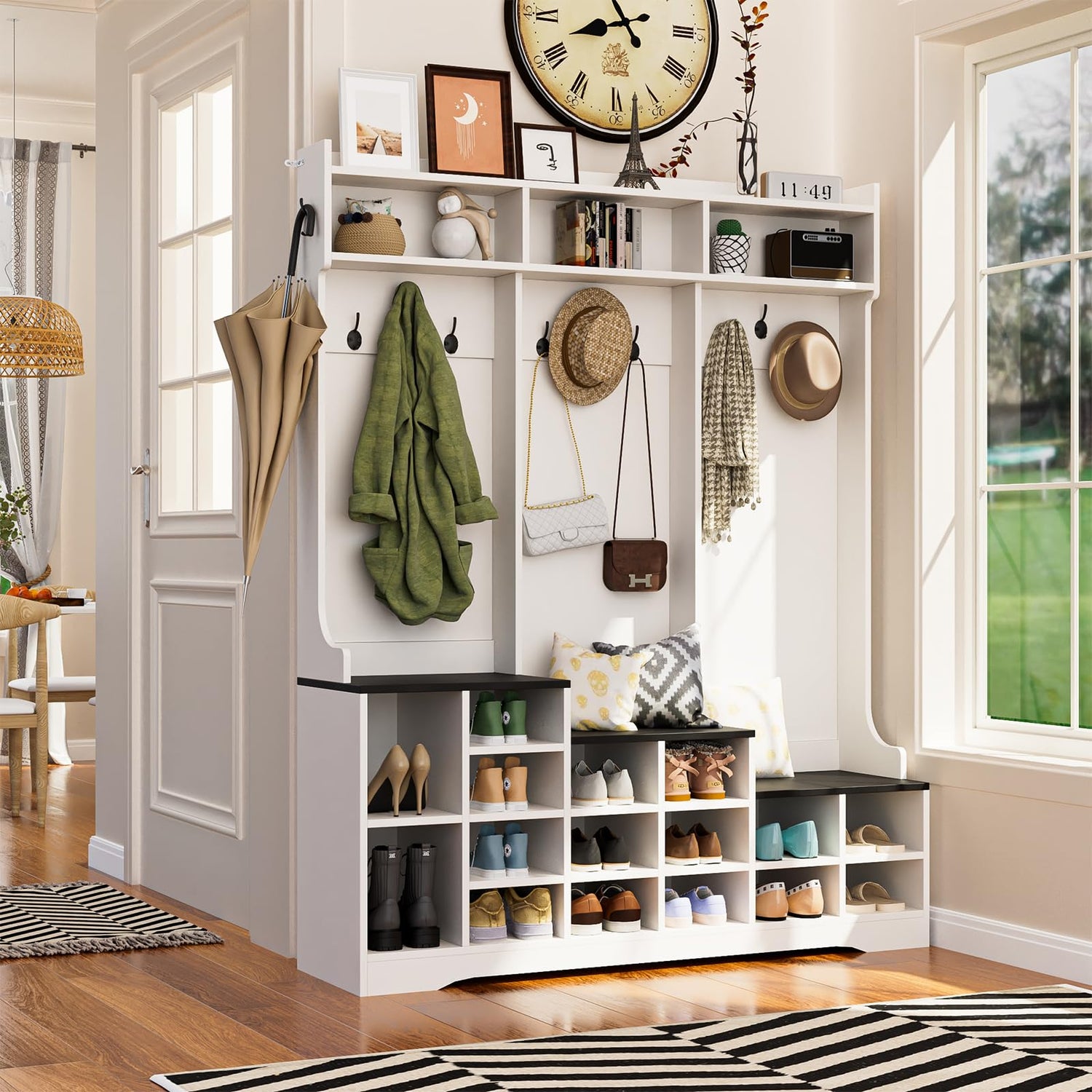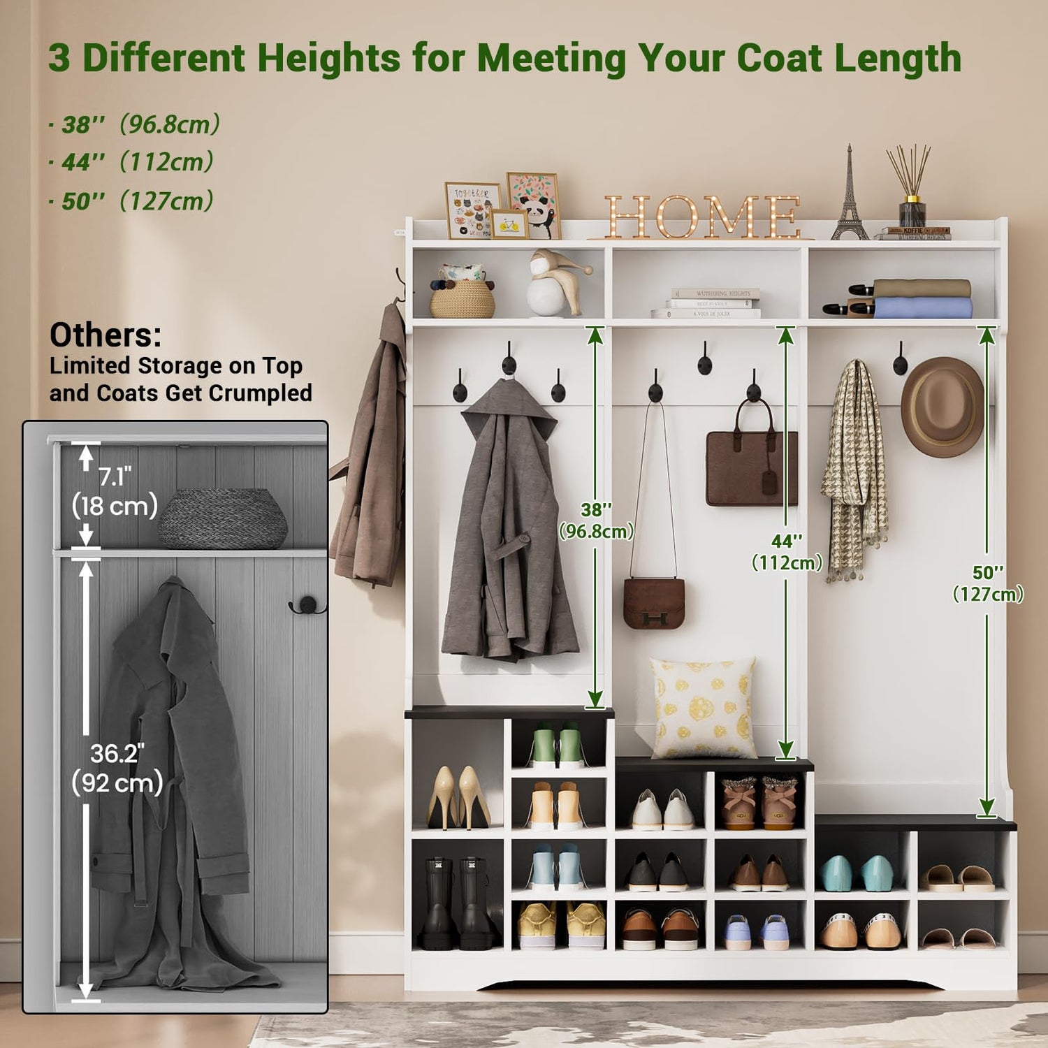 77" Hall Tree with Shoe Storage and Coat Rack, Farmhouse Entryway Bench, 16 Shoe Cubbies & 10 Coat Hooks, 15.8"D x 59"W x 77"H, Freestanding Entrance Storage Cabinet for Entryway Hallway, White