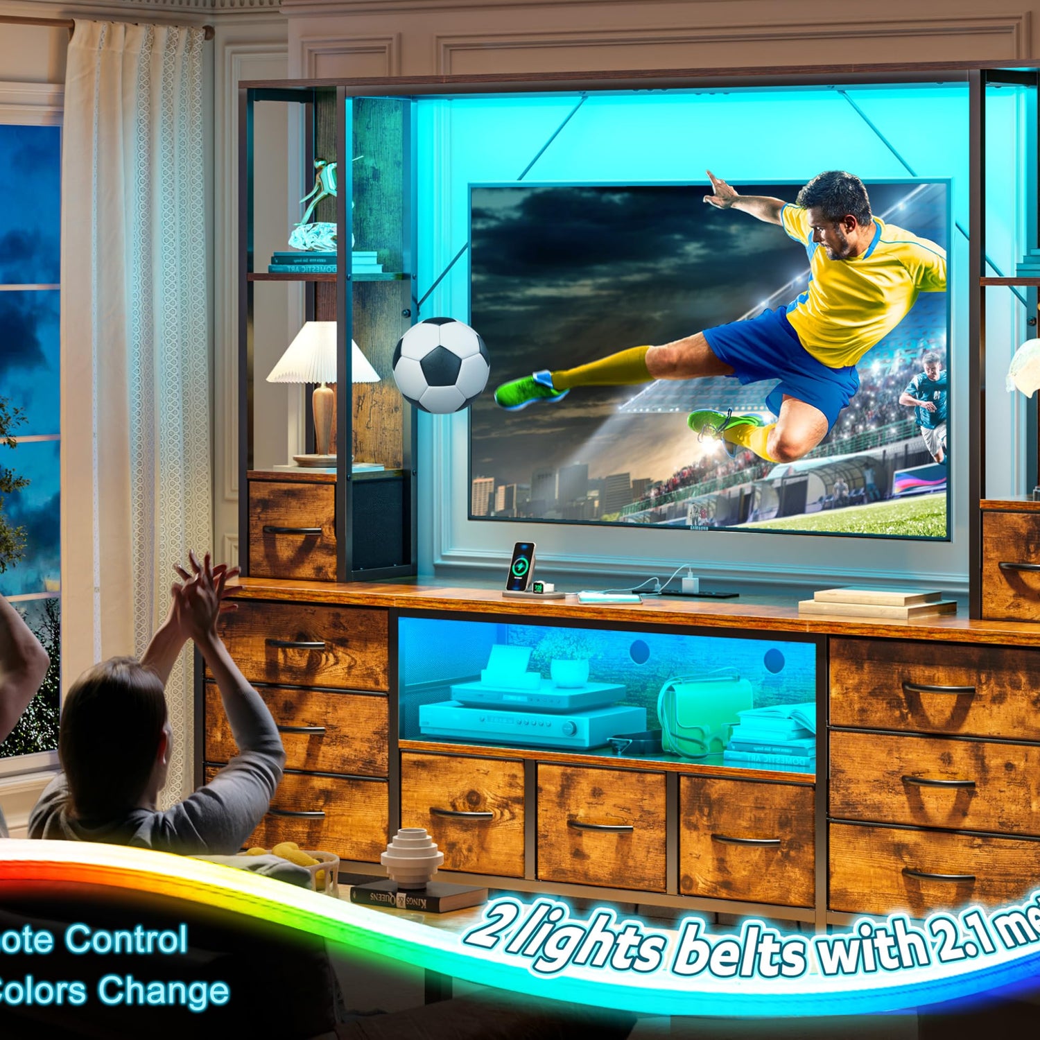 - 【2 Customizable LED Lights】This Tv stand with storage is equipped with 2 LED lights on the upper and lower boards and can reach 2.1 meters via USB connection; This led lights comes in 20 colors and 22 dynamic modes, and the led Tv stand can be adjusted with a remote control to improve the atmosphere of the living room and enjoy a wonderful evening with the family.