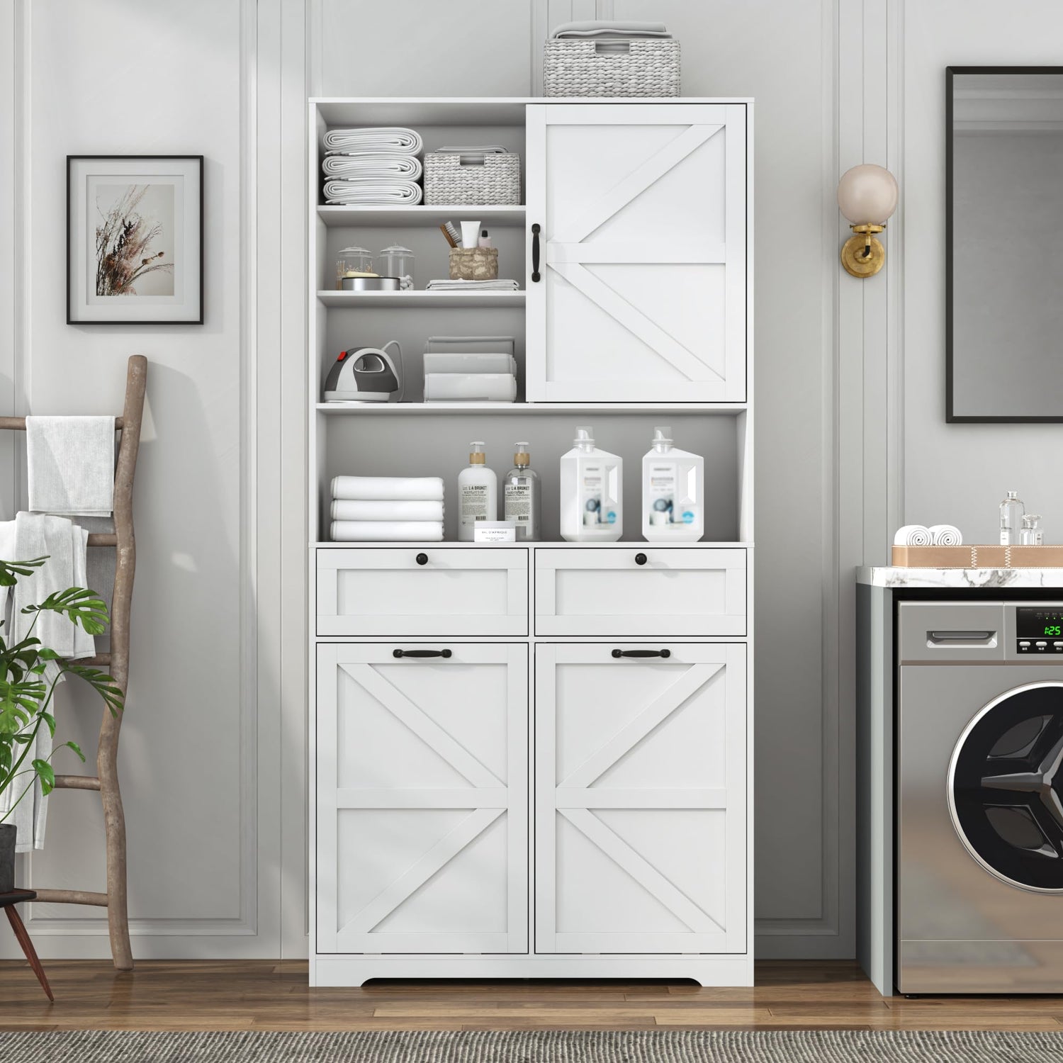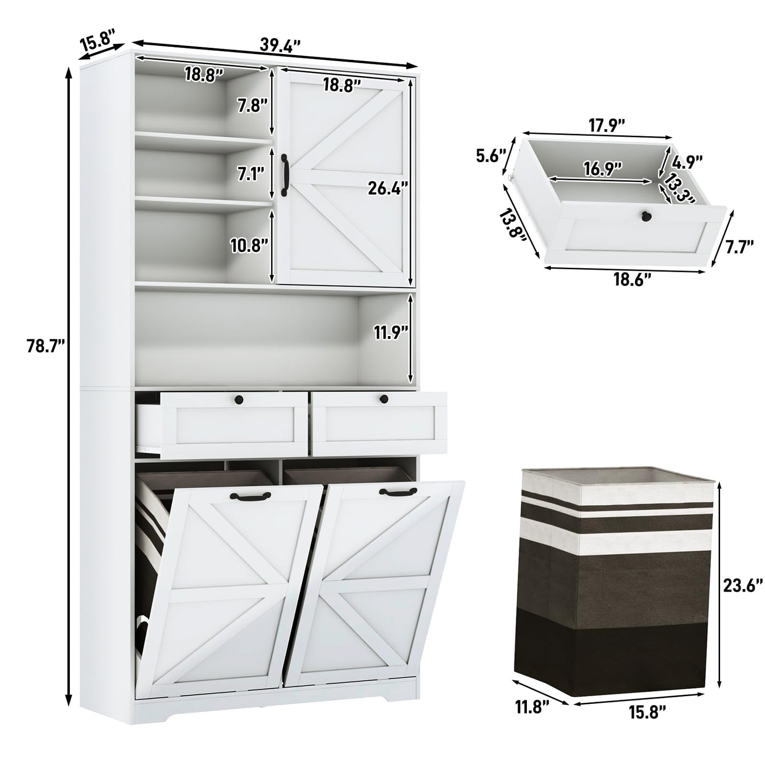 78" Tall Tilt-Out Double Doors Laundry Cabinet Hamper w Hidden Laundry Hamper,Large Pull Out Laundry Room Storage Cabinets,Kitchen Double Tilt Out Trash Cabinet,13X2 Gallon Bathroom Organizers(White)