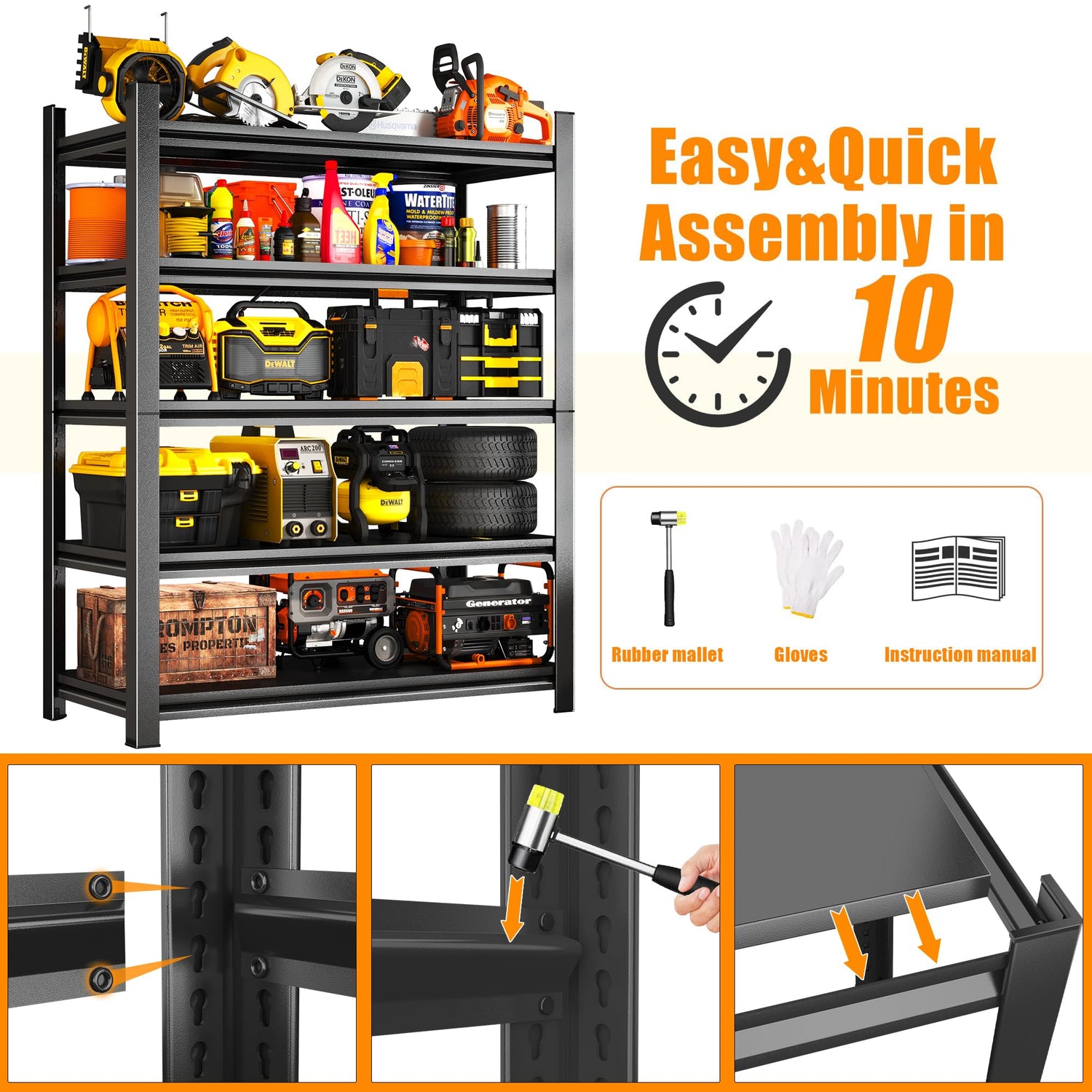 - Easy and Quick Assembly: To eliminate the hassle of complicated setup, our metal shelving features an innovative bolt-free quick-connect design. What's more, it comes with a rubber mallet, a pair of gloves, and a clear instruction manual—complete with detailed tutorials and step-by-step guidance. In under 10 minutes, you’ll have a sturdy, stable, and practical shelf ready to use. It’s the perfect choice for garages, basements, warehouses, and more. With it, you can enjoy a neat and organized space right away
