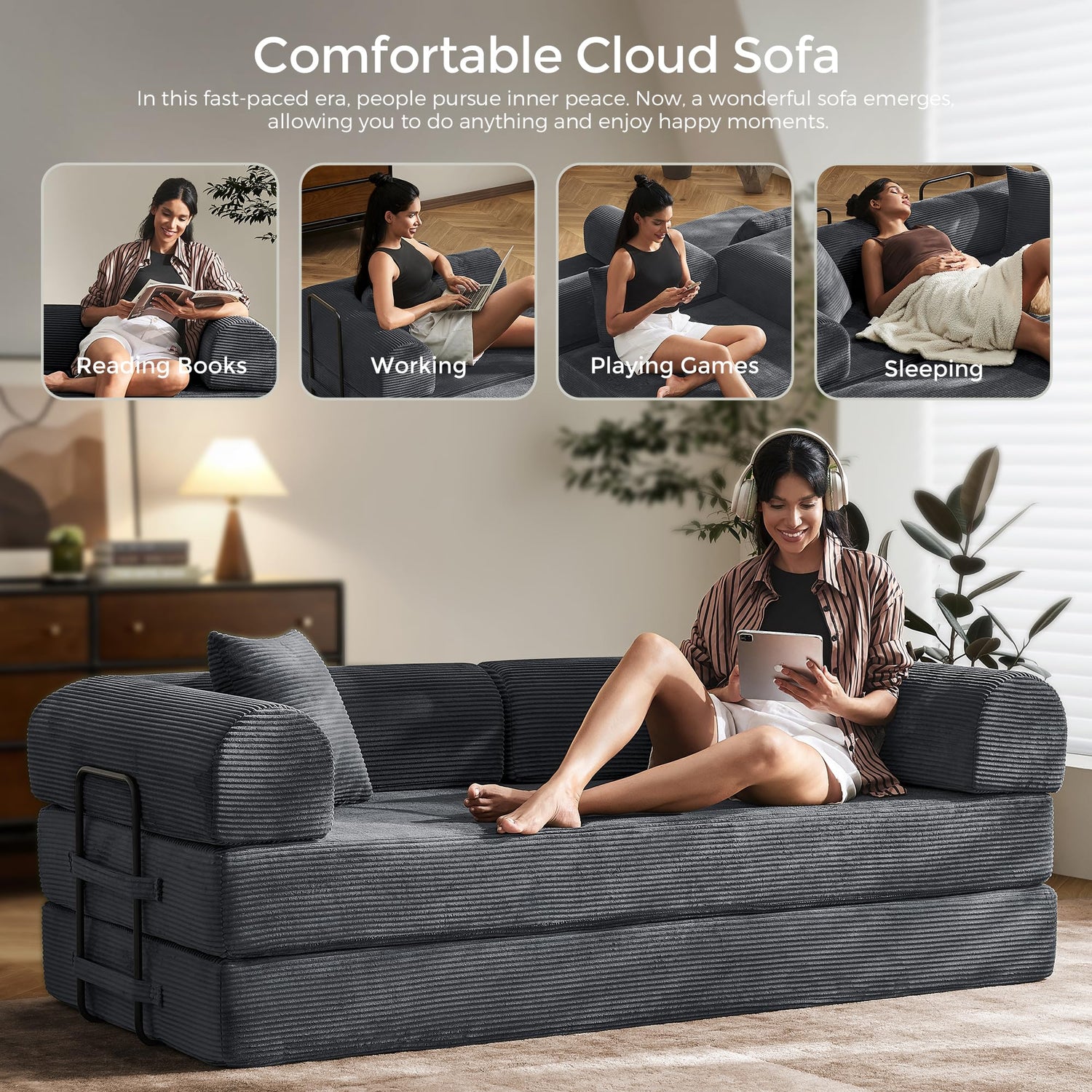 79" Convertible Sofa Bed with Fixed-Shape Frame & Removable Armrests, Modular Corduroy Sleeper Sofa, Folding Mattress Couch for Small Spaces - No Assembly Needed in Dark Gray (Includes 2 Pillows)