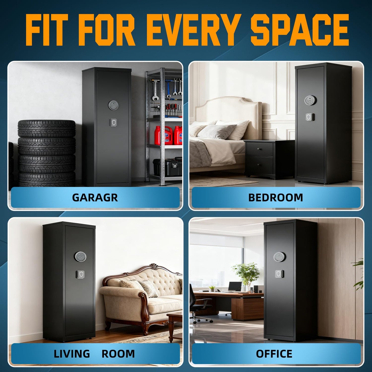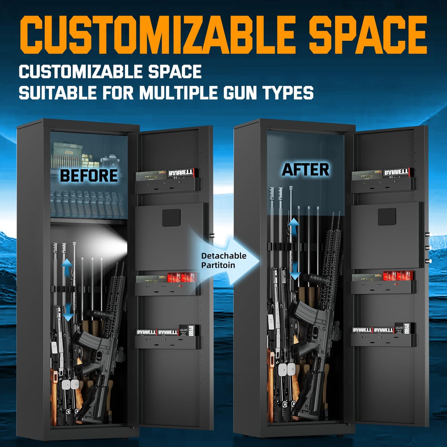 - 【 SPACIOUS & CUSTOMIZABLE INTERIOR】 Measuring 57.1″ (H) x 13.8″ (W) x 11.8″ (D), The interior of this large gun safe is flexible and can safely store 6 to 10 long guns with scopes or shotguns no longer than 53 inches. Its flexible layout includes two removable shelves and an adjustable partition, it accommodates scoped rifles, AR15s, and shotguns—perfect for organized gun and accessory storage