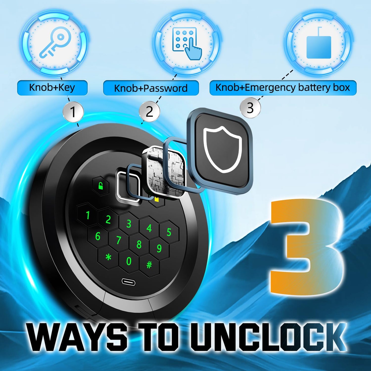 - 【3 WAYS TO UNLOCK, MORE CONVENIENT】①The gun safe for rifles can be set a total of 2 sets of passwords. Enter your password and turn the handle clockwise to open the door②Insert the key, turn the key counterclockwise, and then turn the handle③When the battery is too low, plug in the emergency power box and enter your code to turn it on