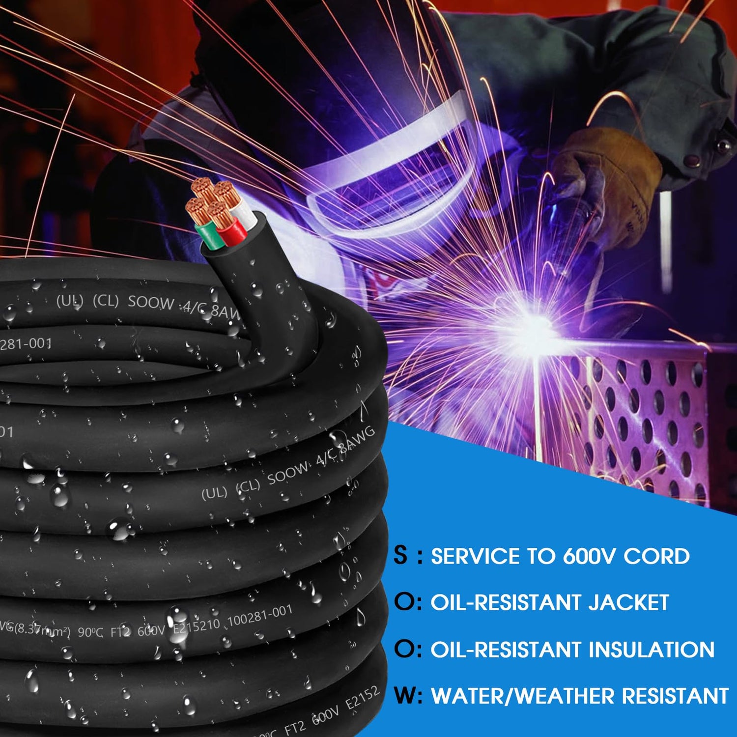 - Water and oil resistant: The 600V 8 AWG SOOW wire 8/4 8 Gauge 4 conductor SOOW electric wire (SOOW-Service, Oil, and Water Resistant) is designed to withstand harsh conditions, perfect for industrial/outdoor/commercial use,including NEMA 14-35 amp welder machine/power generator/RV outlet box/electric car charger/fryer/dryer.