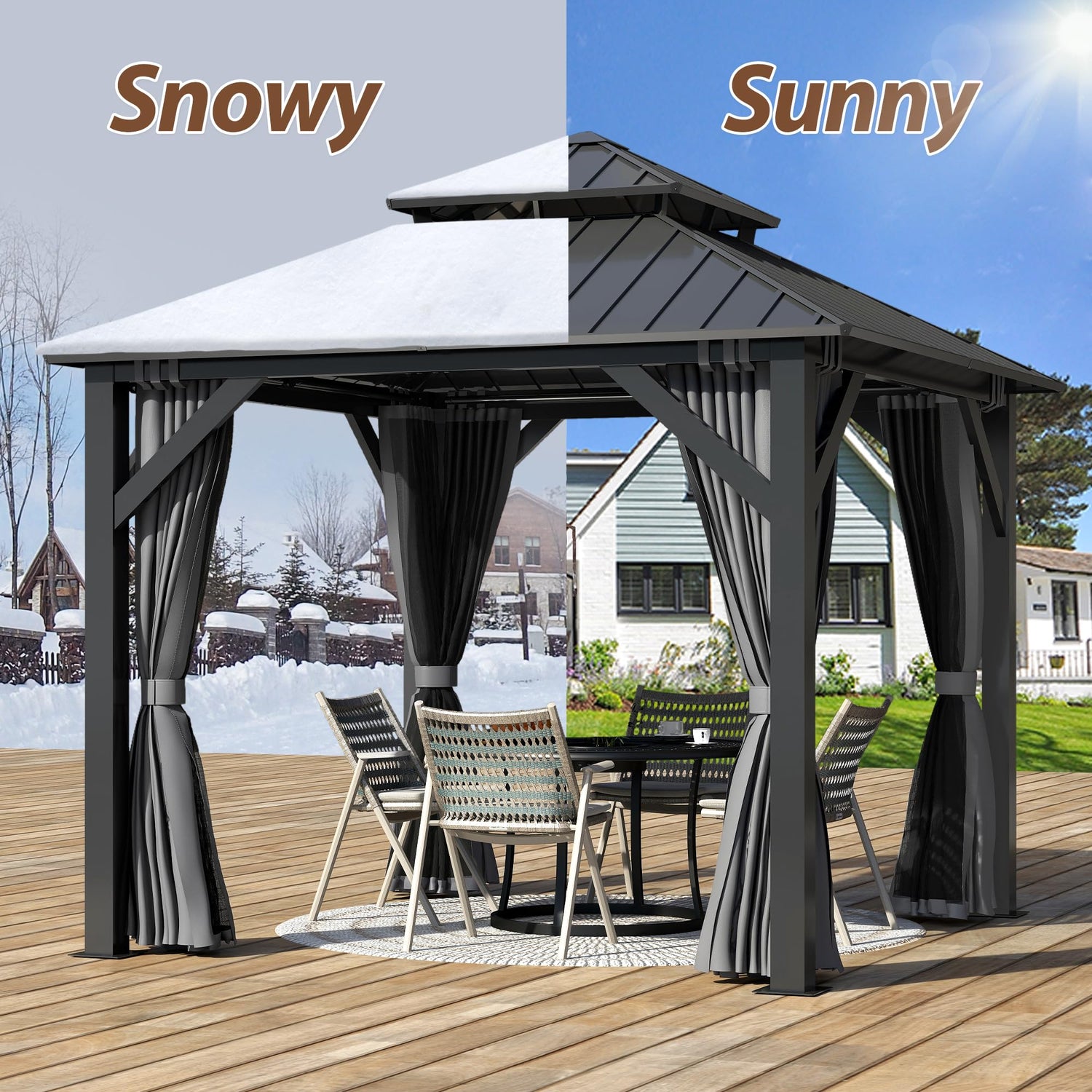 - DOUBLE VENTED HARDTOP DESIGN: (Please do not use in strong wind and clear the snow promptly.)The double-vented hardtop design allows for excellent airflow, keeping you cool and comfortable in hot summer. Vertical striped roof design for better drainage.The gazebo for patios is a great addition to your outdoor space.