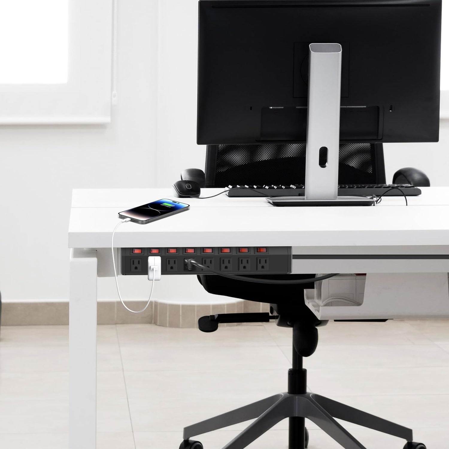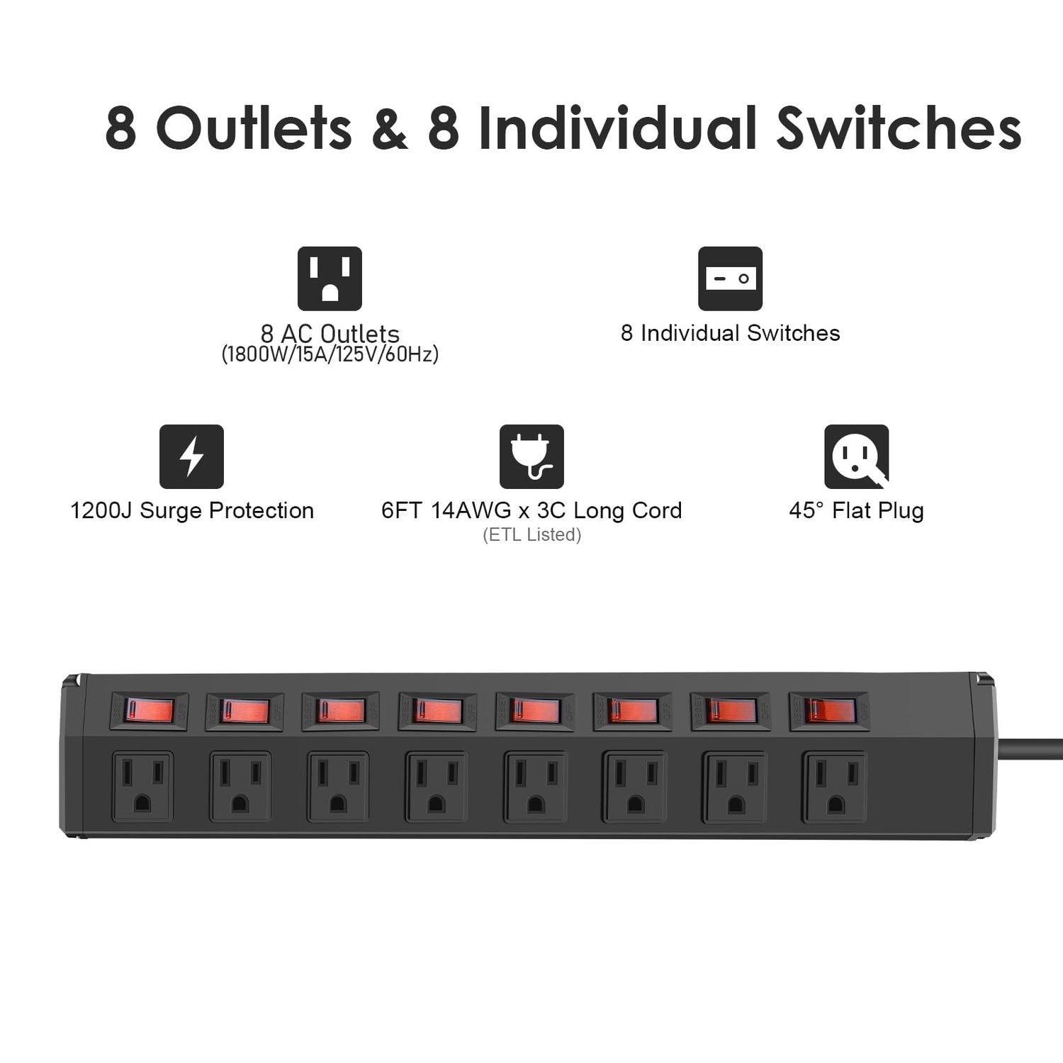 - Versatile 8 Outlet Power Strip: Features 8 wide-spaced AC outlets, suitable for plugs of various sizes without blocking each other. Power multiple devices simultaneously. With 1200 joules of surge protection, protects your electronics from damage caused by surges, spikes or power outages.