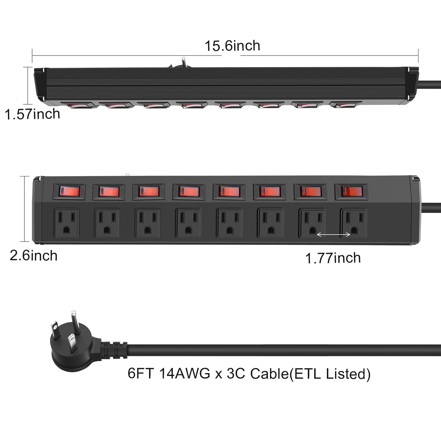 8 Outlet Heavy Duty Power Strip with 8 Individual Switches,Moutable Metal Power Strip Surge Protector 1200 Joules,6FT 14AWG Extension Cord,15A 1800W 125V 60Hz