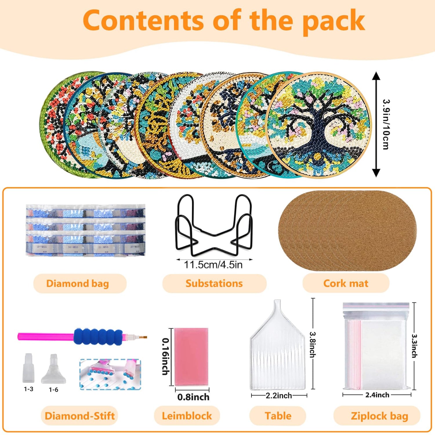 - 【Package Included】You will receive diamond art coaster x 8, cork pad x 8, coaster holder x 1, clay glue x 1, diamond pen x 1, diamond tray x 1,1 set colored diamonds.Diamond art coasters kit for adults also comes with a black metal coaster clip for easy storage.