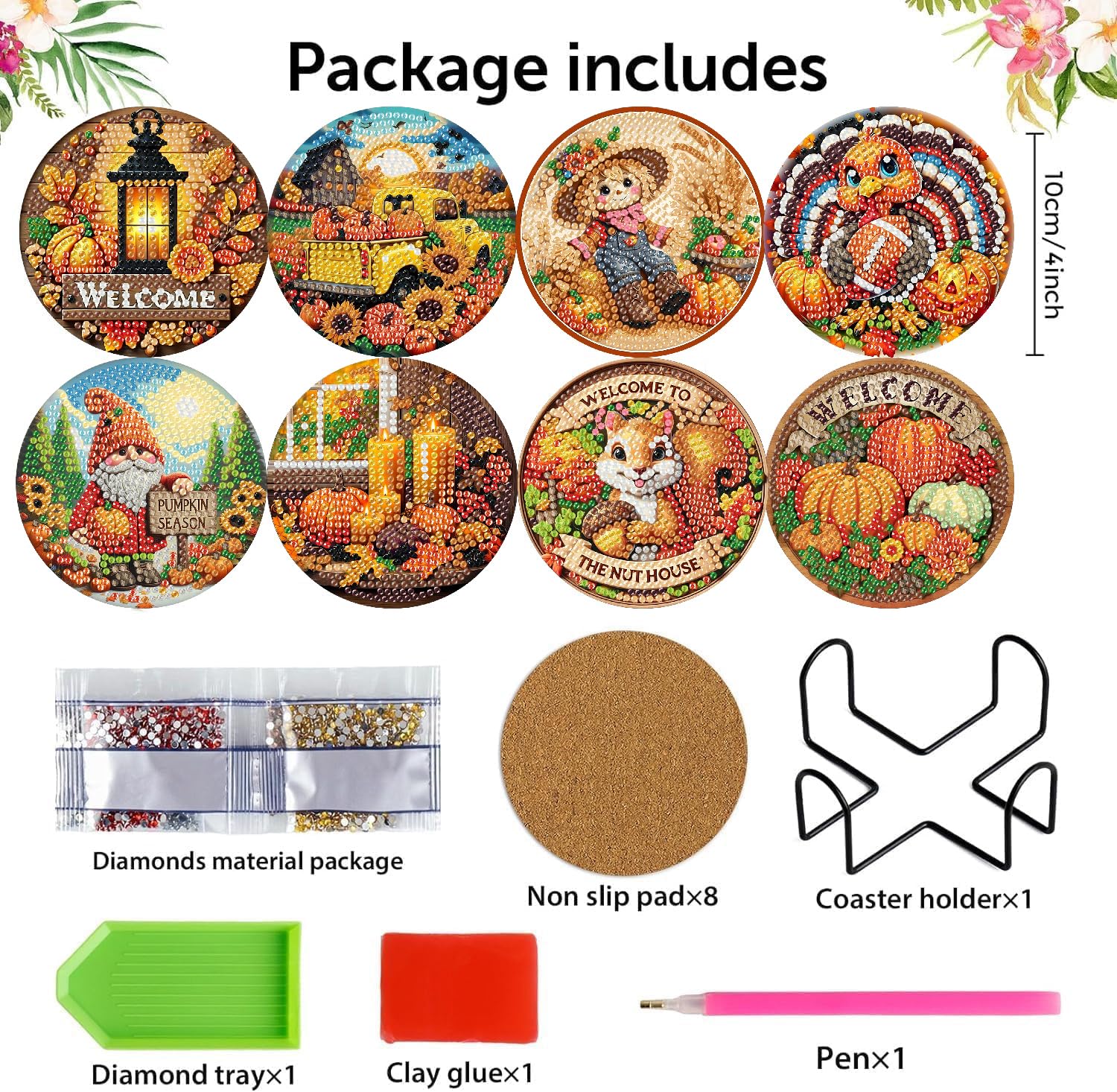 8 Pcs Fall Diamond Art Painting Coasters Kits,Thanksgiving Day Coaster with Holder for Adults, Non-Slip DIY Dot Paint Craft Kits,5D Full Drill DIY Diamond Dot Gem Art Kit Home Decor Arts Craft