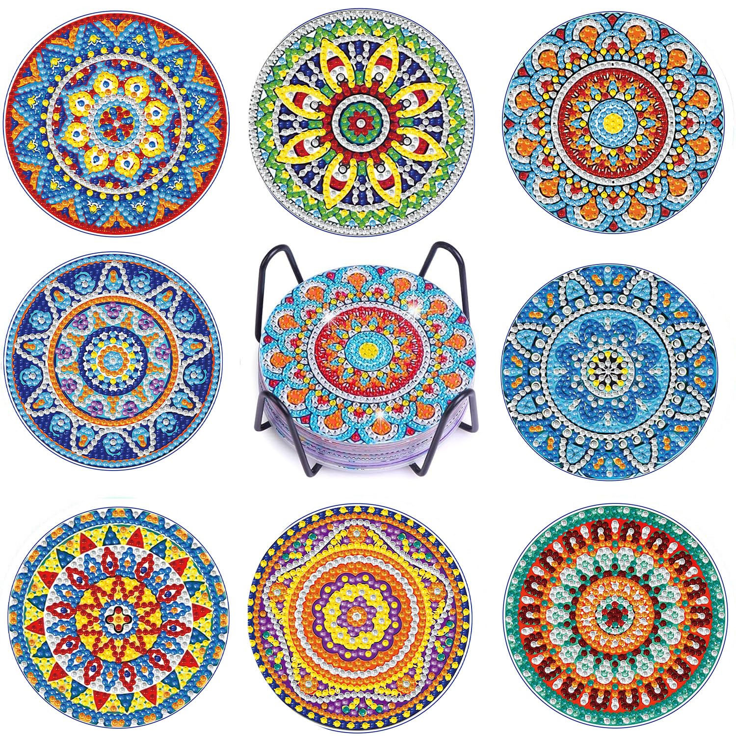 - Package Included: mandala diamond art painting coaster x 8, cork pad x 8, coaster holder x 1, clay glue x 1, diamond pen x 1, diamond tray x 1,1 set colored diamonds. With a black metal coaster holder for convenient storage