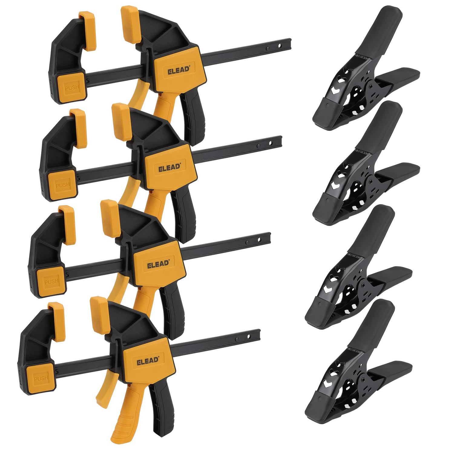 - VERSATILE SET - This 8-piece clamp set includes 4 pcs 6 inch bar clamps and 4 pcs 6 inch heavy duty metal spring clamps, perfect for various woodworking and crafting needs.