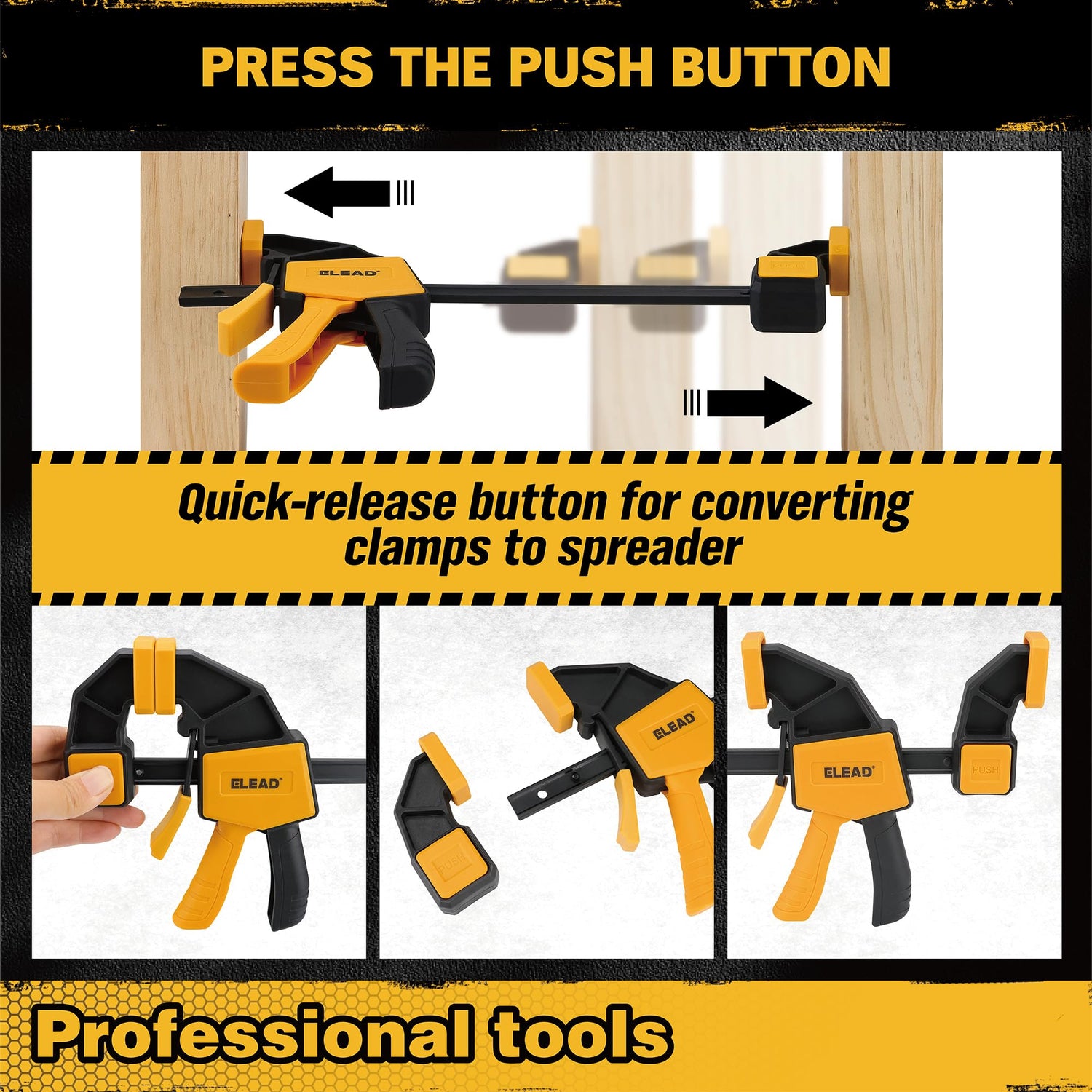 - DUAL FUNCTION - Bar clamps feature quick release triggers and can also function as spreaders. Simply press the yellow button, reverse, and reinsert to transform into a spreader tool.