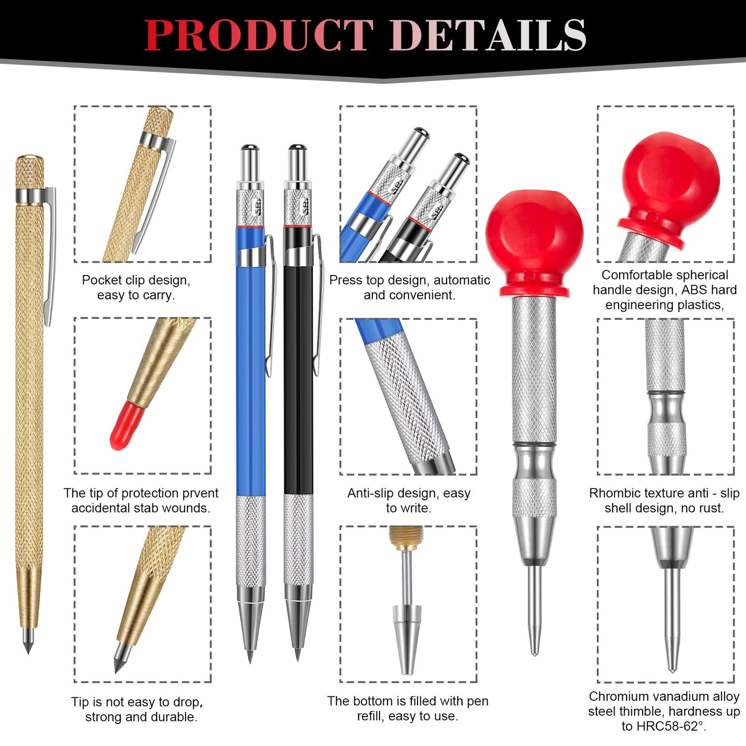 - Complete Set: the package includes 4 pieces of carpenter pencils in 2 styles, including 2 pieces of red and blue carpenter pencils with sharpeners, 1 black and 1 blue carpenter drafting pencils, 1 piece of gold carbide scribe tool and 1 piece of automatic center hole punch tool; It also comes with 2 sets of marker refills, respectively 1 set of red and black combinations and 1 set of black and gold combinations, sufficient quantity and nice set can satisfy your daily uses