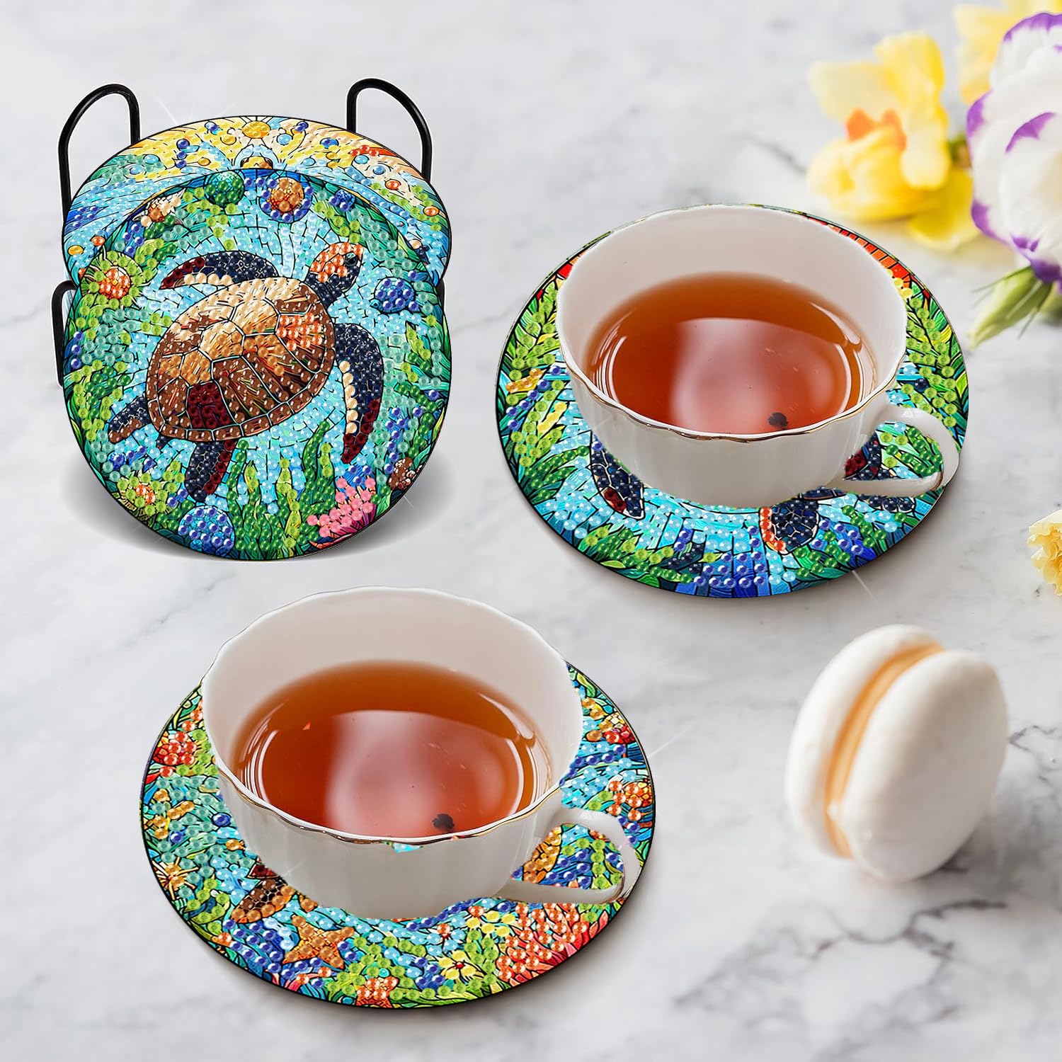 - 【Sea Turtles Diamond Art Coasters】: You will get 8 art coasters, 1 coaster holder, 1 diamond pen, 1 diamond tray, 1 clay glue and enough number of molded diamonds for a cute and shiny home decor.