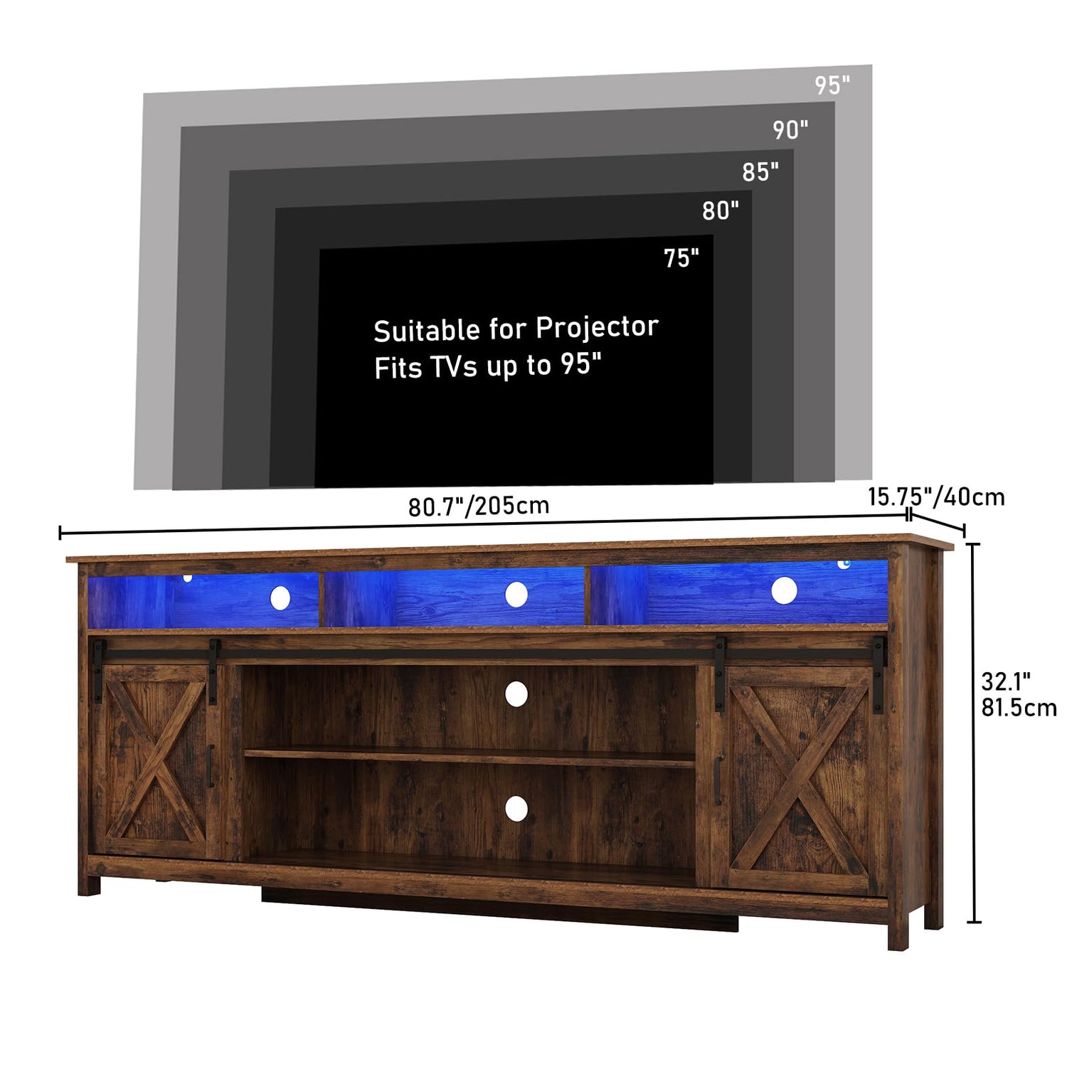 - Large LED Farmhouse TV Stand:Product Size: 70" x 15.75" x 32.1" (L x W x H). Our tall Entertainment Center are for TVs up to 80in,75in,70inch TV stand(Diagonal).The storage partition can be adjusted in 3 levels,provide Ample and Flexible Storage Space.Two sliding barn doors can easily be positioned as you desire.