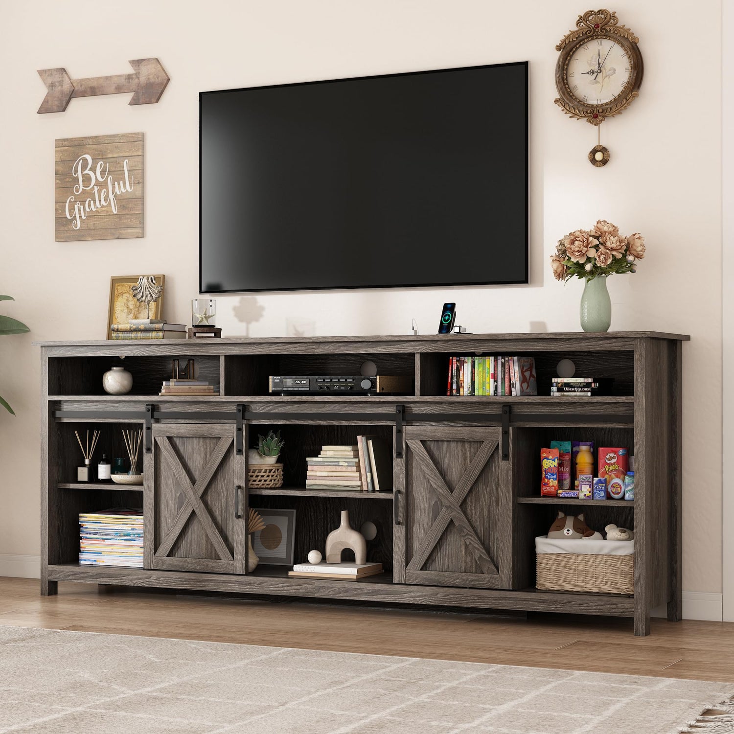 - Large LED Farmhouse TV Stand:Product Size: 70" x 15.75" x 32.1" (L x W x H). Our tall Entertainment Center are for TVs up to 80in,75in,70inch TV stand(Diagonal).The storage partition can be adjusted in 3 levels,provide Ample and Flexible Storage Space.Two sliding barn doors can easily be positioned as you desire.