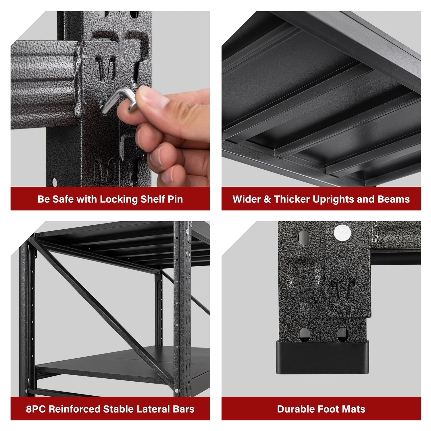- 【WIDER & THICKER Uprights and Beams than standard】 Garage Shelves Heavy Duty use one-piece upright construction,which is not only enhances the overall strength but also allows for a higher load - bearing capacity.The reinforced beams can effortlessly bear substantial loads, ensuring the garage shelving units remains steadfast even under heavy usage.Enabling the metal shelf to support a total weight of up to 8000 pounds.