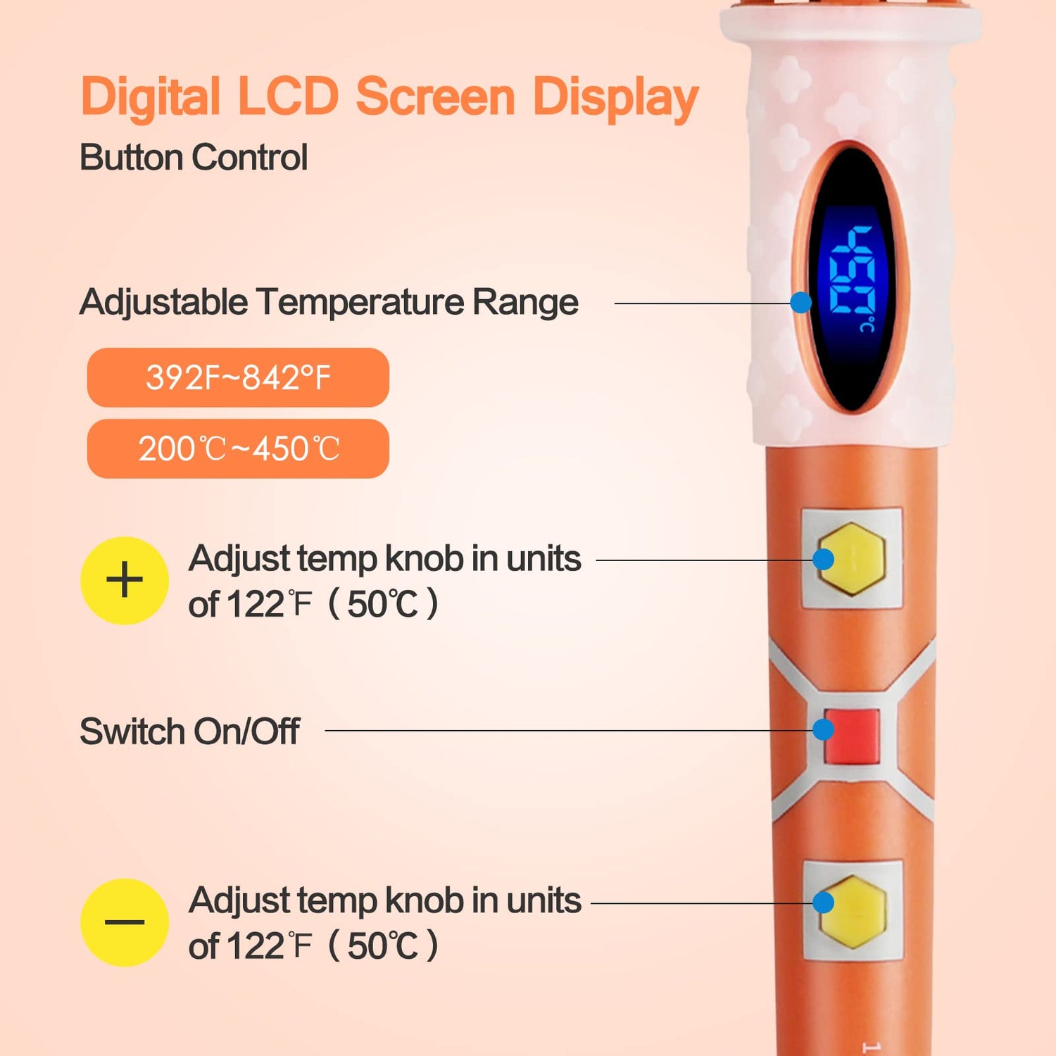 - [LCD Display]-The high-definition LCD display can show the precise temperature of the soldering gun. With the temperature “+” and“-” buttons on electronic soldering kit, you can adjust the temperature from 200℃ - 450℃ (392℉ to 842℉)Adjust every 50 degrees. According to your needs, the temperature is easily adjusted by the temperature adjustment button, simple and efficient operation.