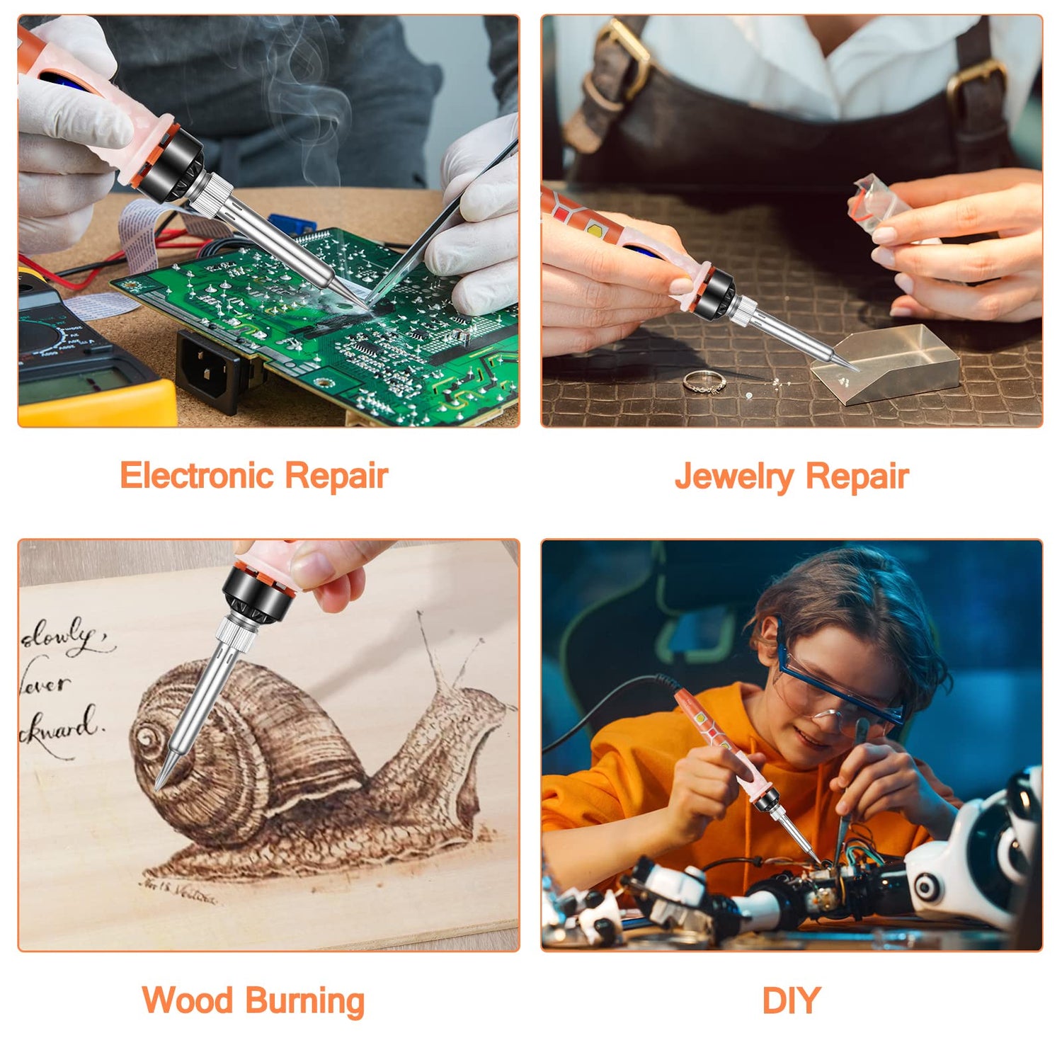 - [Wide Applications]- This soldering kit is a good choice for electronic circuit boards, DIY home repairs, jewelry, guitar, watches, computer hardware, and small electronic work. Also, these soldering iron tools can be used for pyrography and carving words. It is suitable for both beginner and electronics hobbyists