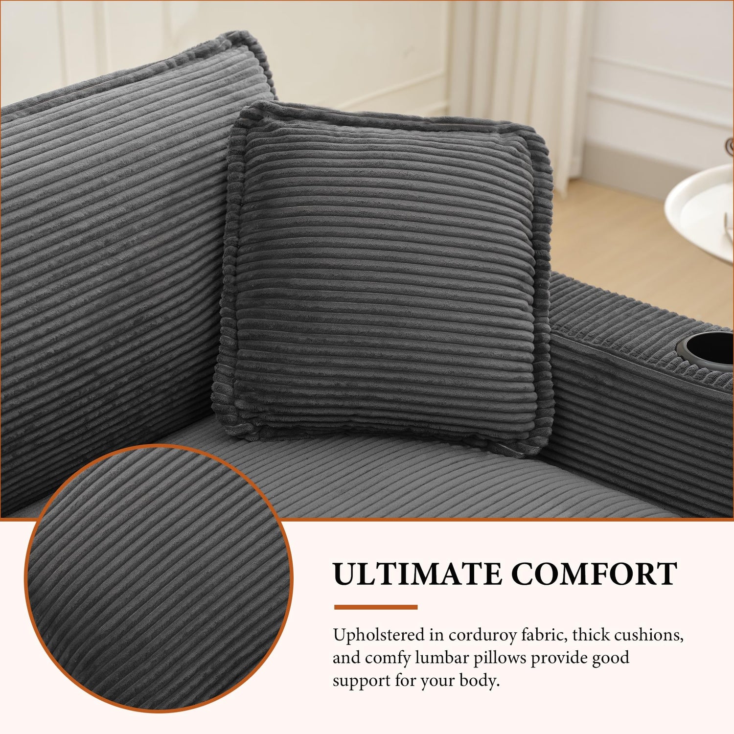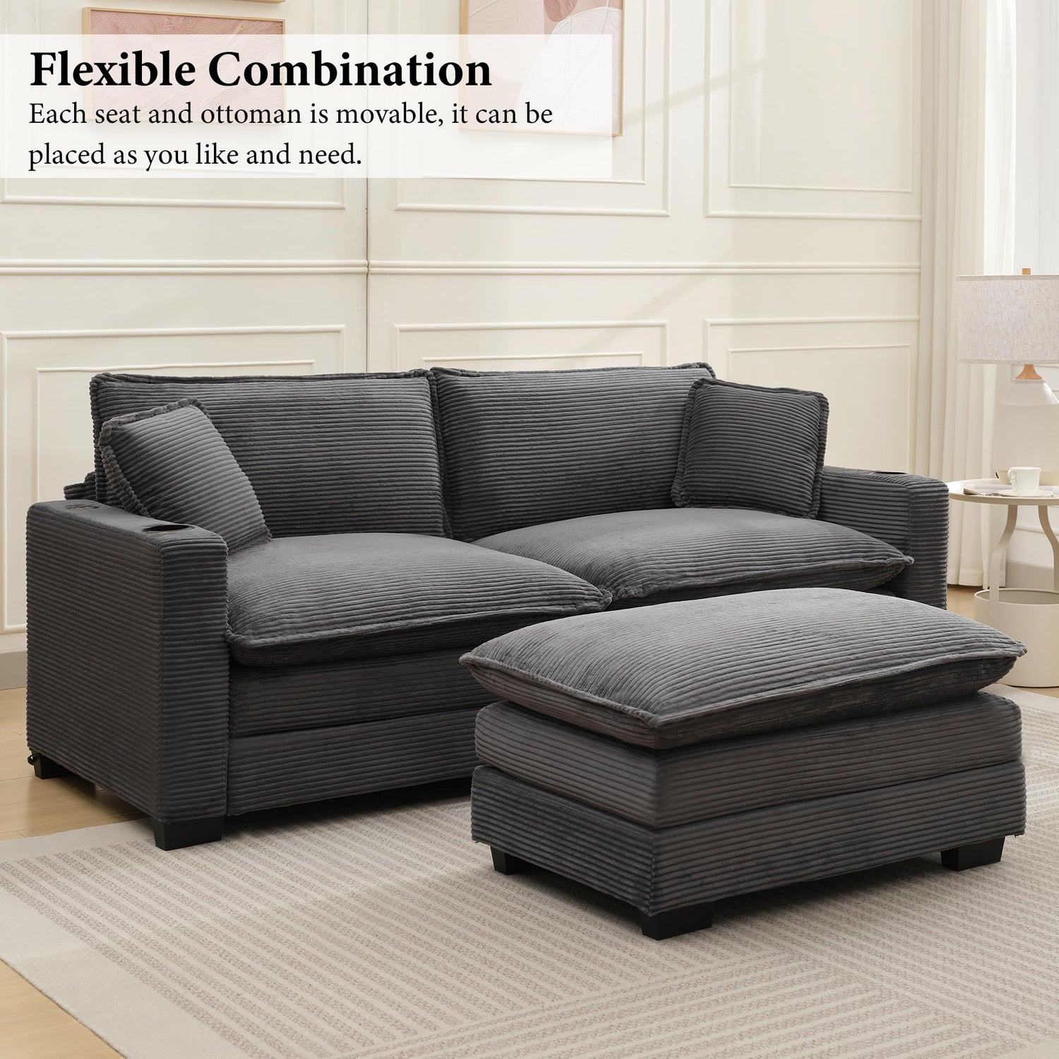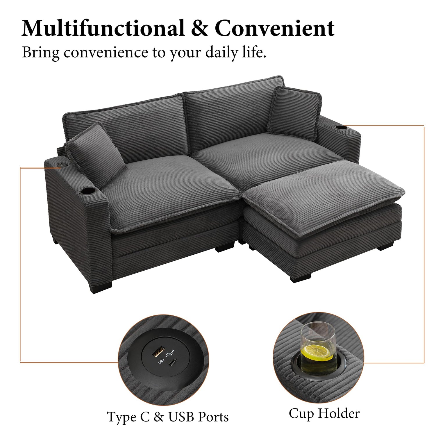 82.7" L Shaped Sectional Sofa with Cup Holders & USB Ports, Modern Loveseat Cloud Couch with Ottoman for Living Room, Apartment, Small Spaces, Grey Corduroy