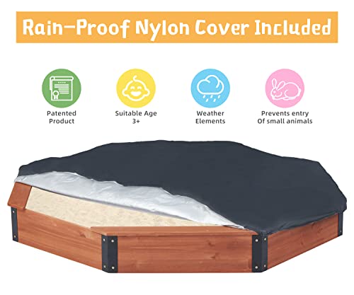 Details: Octagon Wooden Cedar Sand box w Seat Boards | Eco-Friendly Cover & Ground Liner | 84" X 78" x 9" | 3/4" Cedar Boards | Easy DIY Assembly | Holds 800+ lbs of Sand | Natural Cedar Beauty Built To Last
