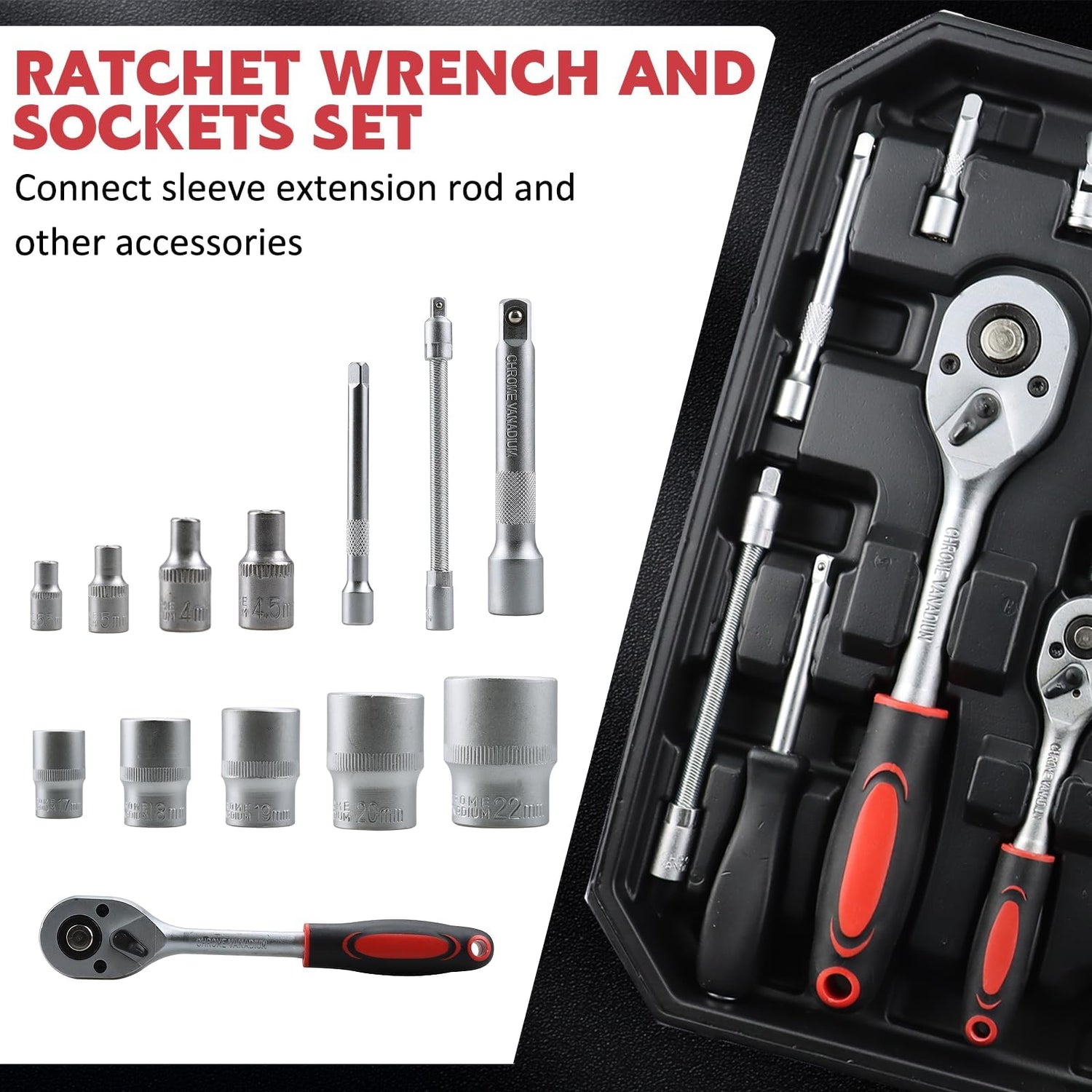 - [Removable Trolley Case design] - The tool box set comes with an easy-to-move trolley bars and wheels that great for Indoors and Outdoors, and the internal tray for storing tools is made of plastic to reduce the weight of the overall toolbox. wherever you go, our portable toolbox is convenient to carry and save effort.