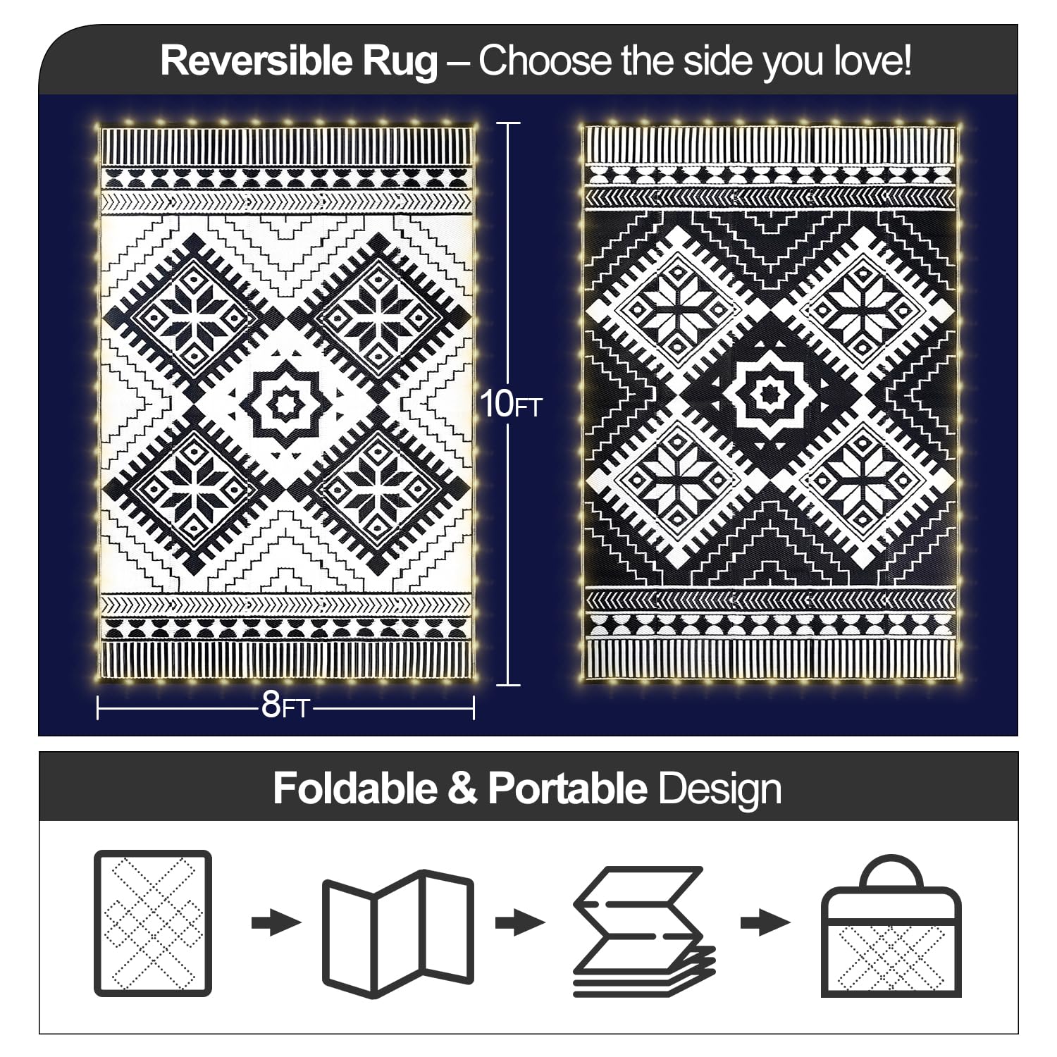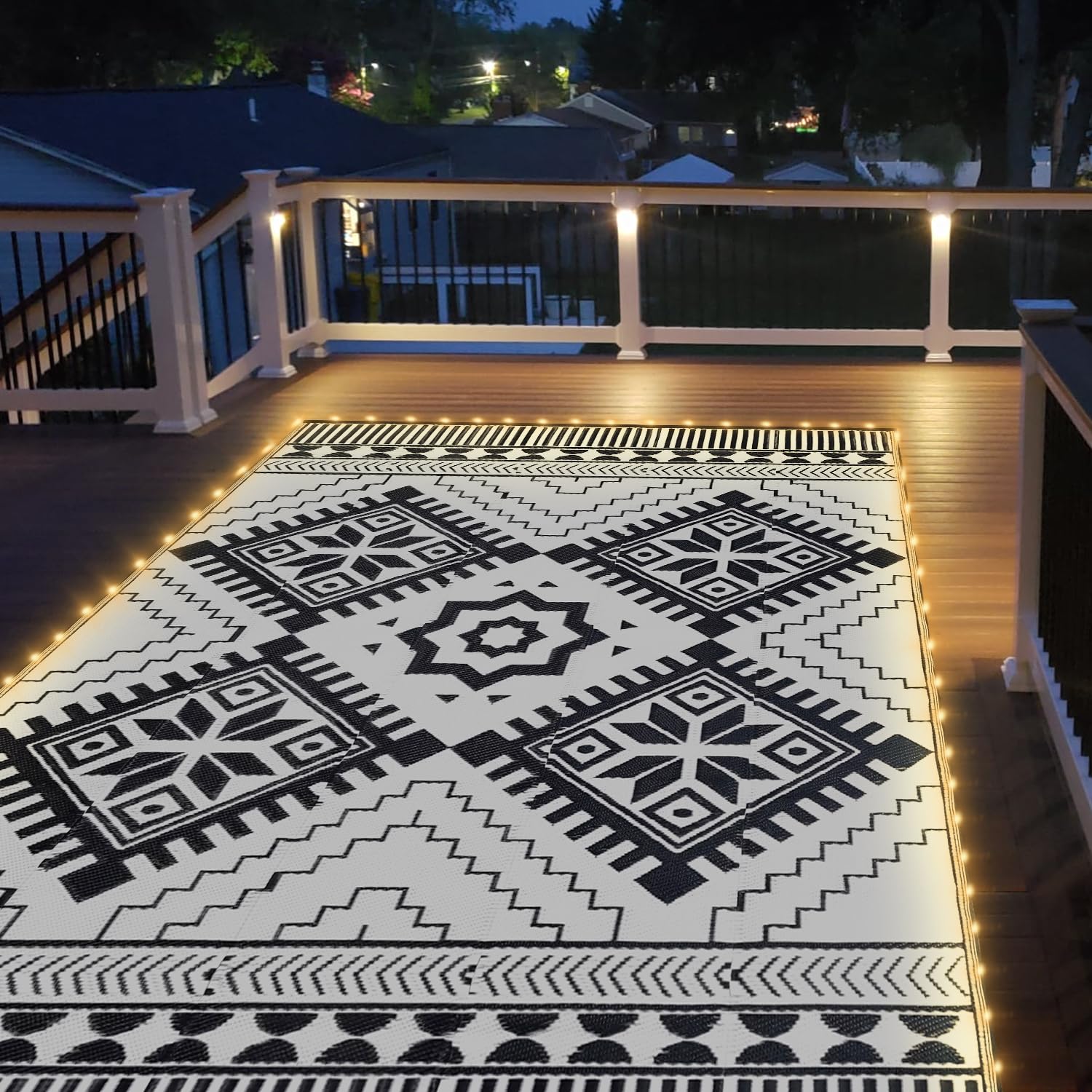 8x10ft Waterproof Outdoor Rug with LED Lights, Boho Reversible Plastic Straw Mat for Patio RV Camping Picnic Balcony Beach Deck Indoor Outdoor Carpet, Black&White