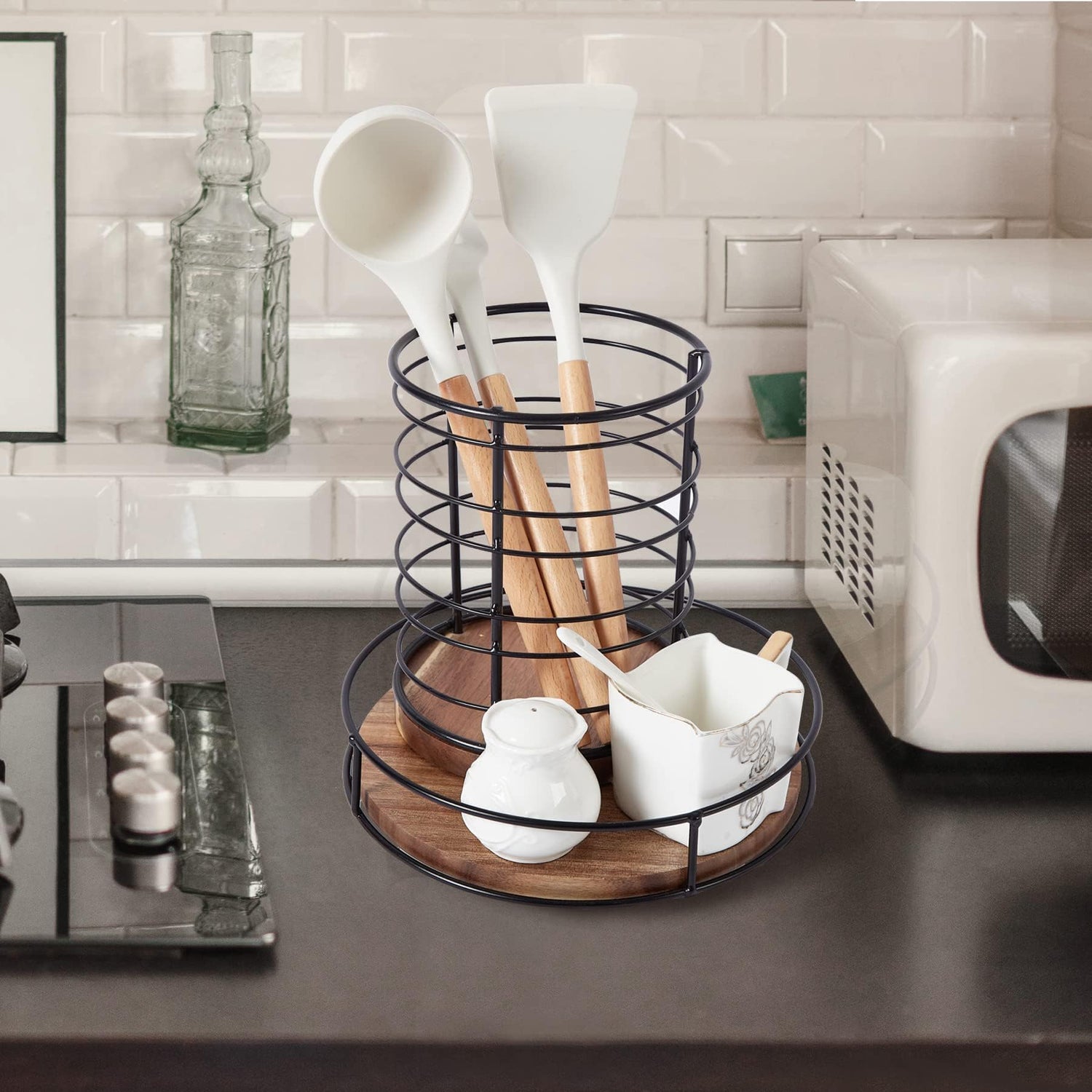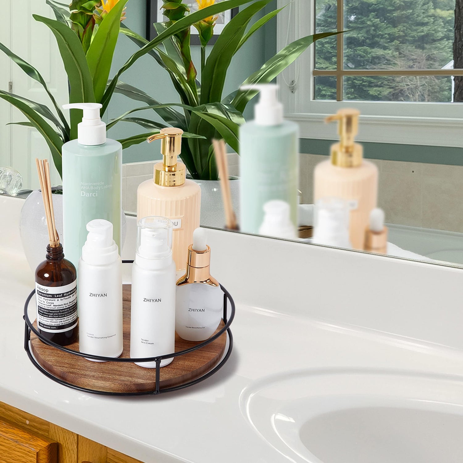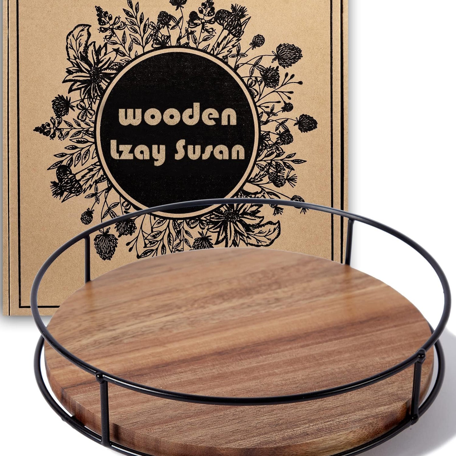 9" Acacia Wood Lazy Susan Turntable, Tomoaza Kitchen Organizer Turntable with Steel Sides, 360 Degree Turntable for Countertop Cabinet or Dining Table