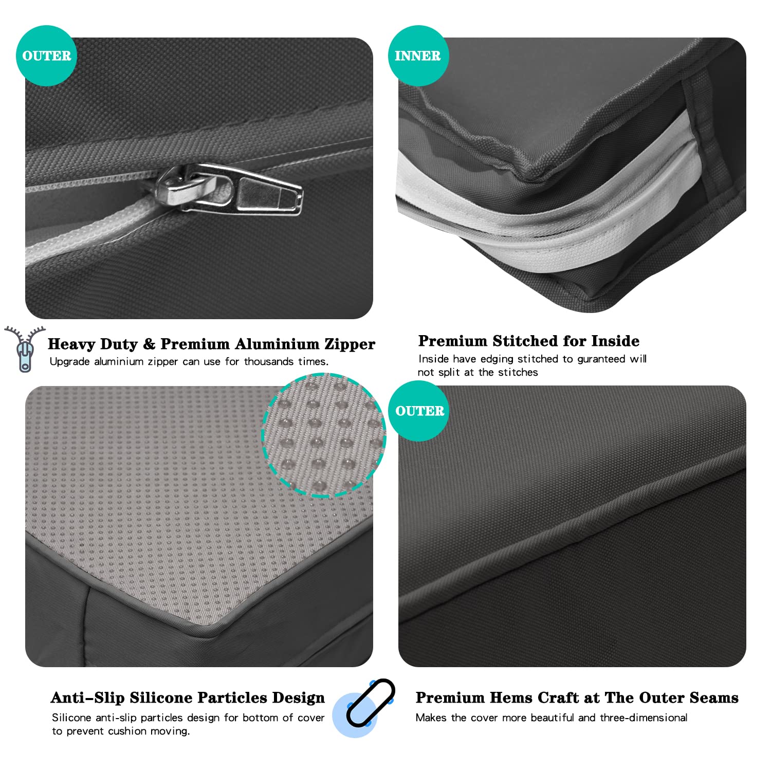 - 5 Exquisite Design Details: (1).Bottom uniform distribution of anti-slip silicone particles,so that the cushion is non-slip.(2).Large and side opening zipper's position design makes installation and disassembly more convenient to install.(3).Arc corner design to keep the shape upright and foursquare of your cushions.(4).Zipper have a semi enclosed hidden design,making overall appearance tidy.(5).Around bulging strips design supports the cushion cover shape solid and beautiful