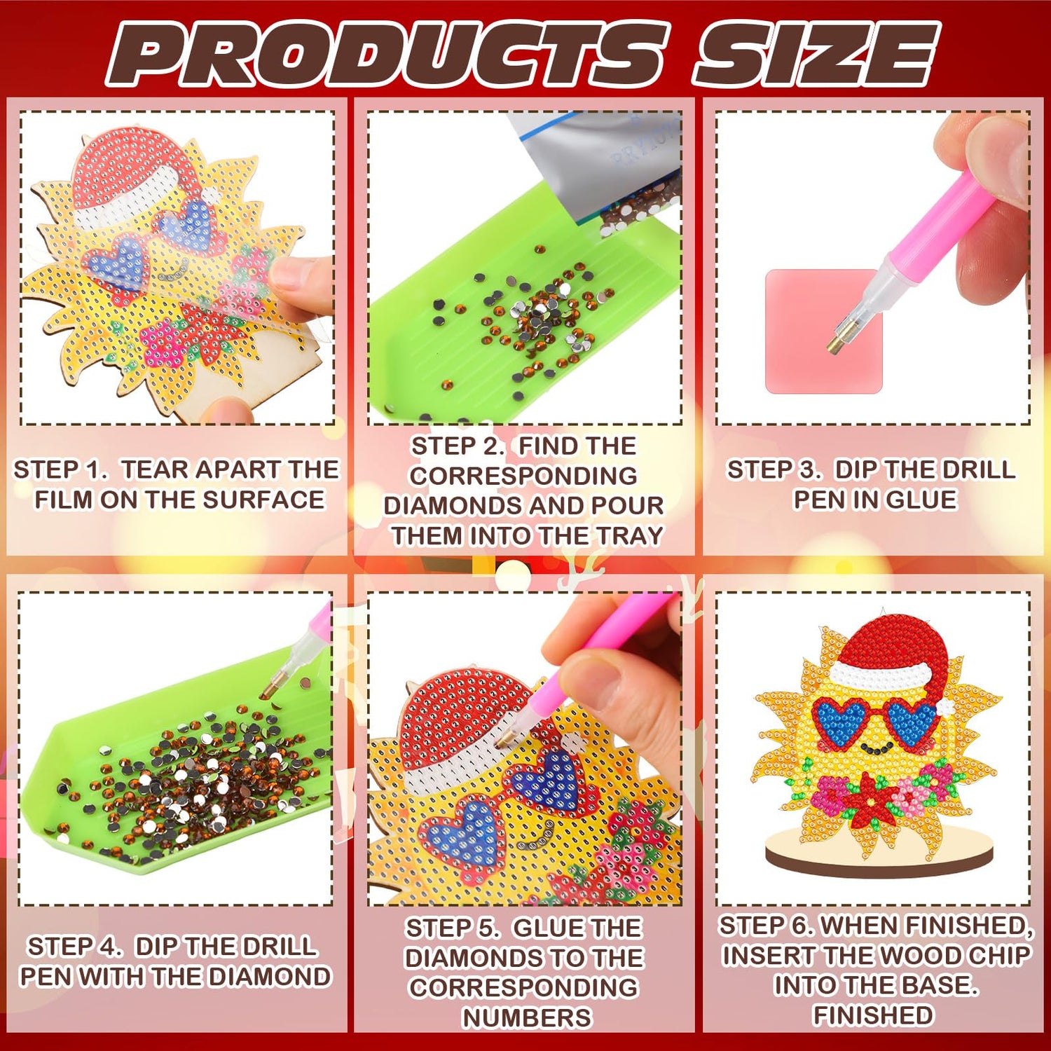 - Installation and User Friendly: simply follow the steps, peel off the film from the wood piece accessory, choose the needed diamond number and paste the corresponding colored diamonds on the wood decorations; Then just insert the decorated wood piece into the base to get your winter diamond art tabletop decorations