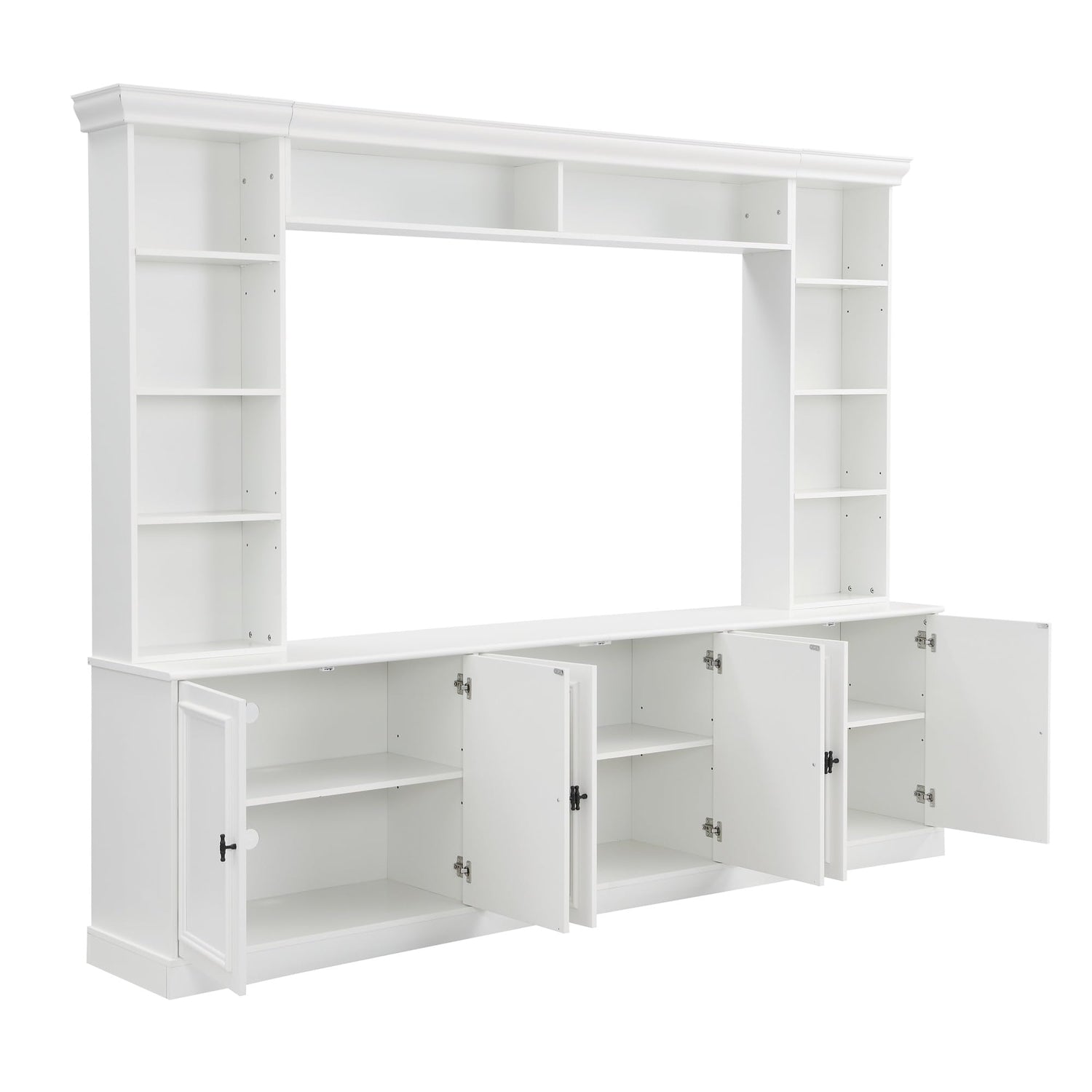 97.4"W Elegant 4-Piece Wall Unit Entertainment Center with Bookshelf for TVs Up to 70", Versatile TV Stand with Adjustable Shelf and Bridge, Mid-Century Media Console for Living Room (White/TV)