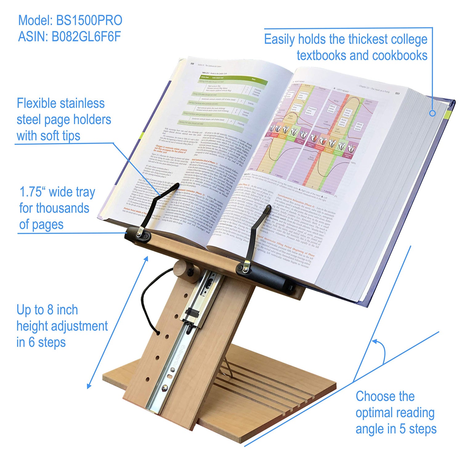 - PATENT PENDING - BOOK STAND BS1500PRO WITH 8" HEIGHT ADJUSTMENT - Easily adjustable height and angle allow for setting the book to perfect eye-Level