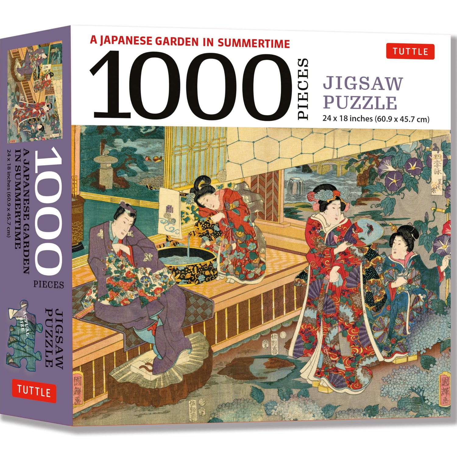 Details: 1000 pieces Finished puzzle is 24 x 18 inches Quality design & easy to handle pieces Features the classic Japanese woodblock print Songs of the Four Seasons: Summer (1853) by Kuniteru Utagawa This print is of Prince Genji and some courtiers enjoying a summer evening in the palace garden