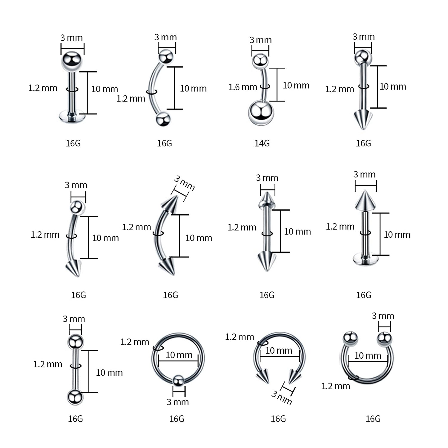 - Piercing Jewelry: (Note: Please wear gloves when unscrewing the ball / cone if it is difficult to unscrew the ball / cone) . 5 pcs belly button(14G) ; 5 pcs titanium industrial barbell(16G, 10mm / 38mm) ; 5 pcs horseshoe nose ring(16G) ; 5 pcs captive bead ring(16G) ; 5 pcs spike horseshoe ring (16G) ; 15 pcs curved barbell ball spike(16G) ; 10 pcs straight barbells jewelry with cone(16G) ; 5 pcs labret stud spike(16G) ; 5 pcs labret barbell(16G) ; All Items are 100% sterilized using EO Gas.