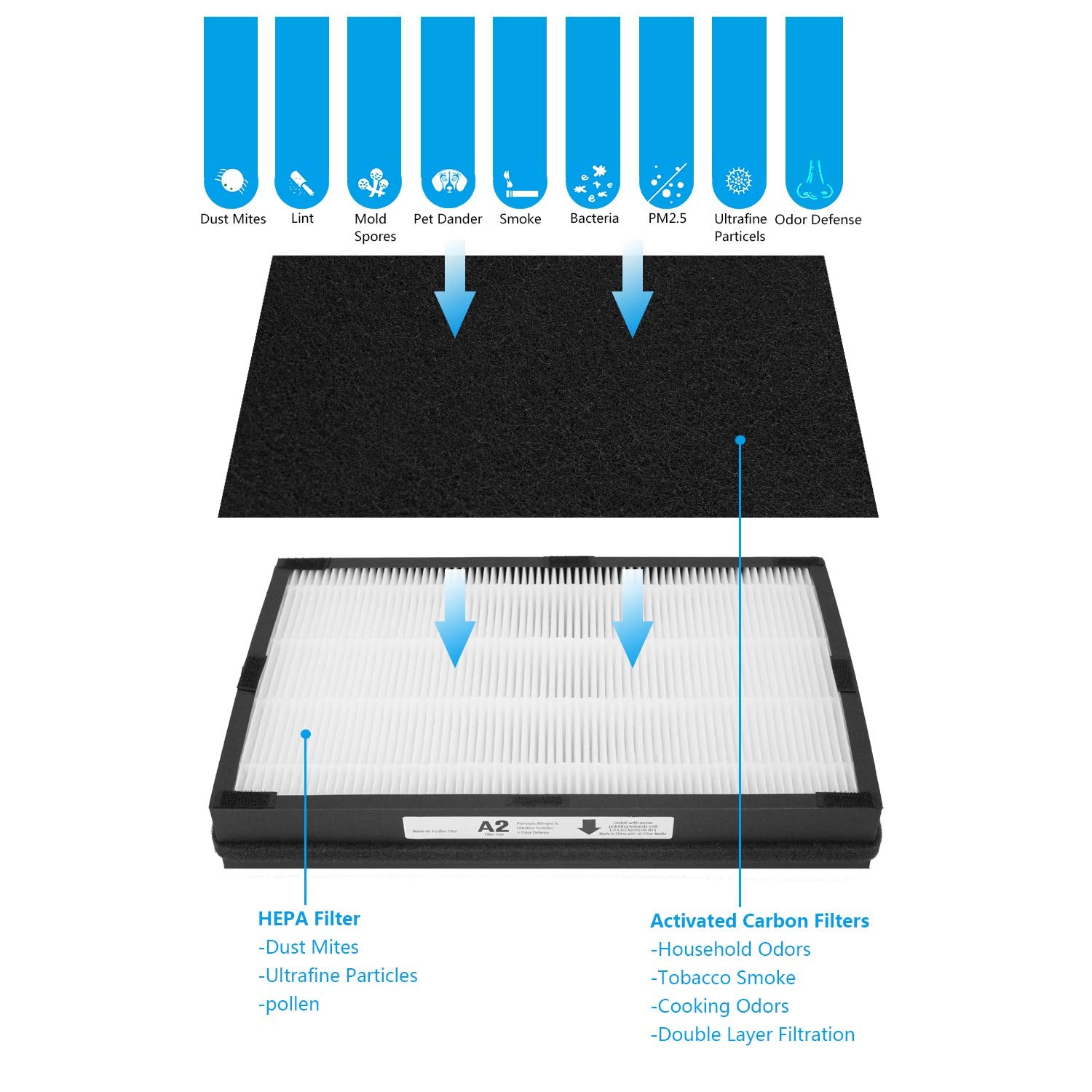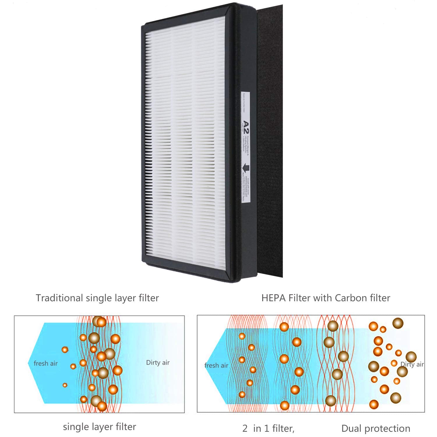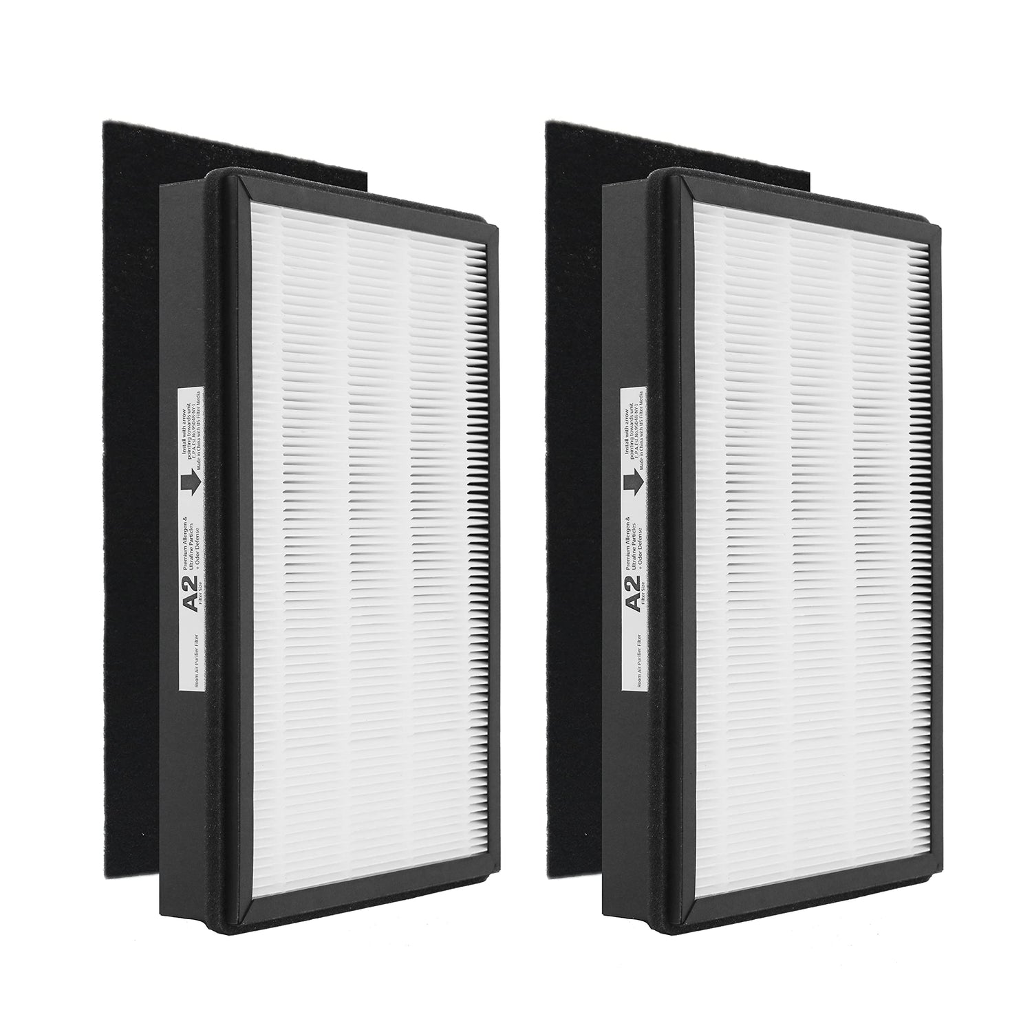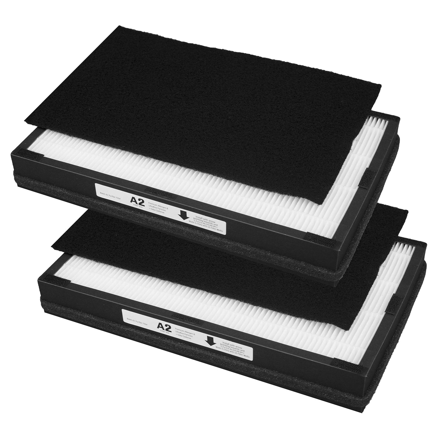 - 【SPECIFICATIONS】- Product Dimensions: L:13.1 x W:8.4 x H: 1.9 inches. Package includes 2 HEPA A2 size Filters +2 Carbon Pre-Filters. Recommended to replace the filter on average 12 months or dependent on usage.