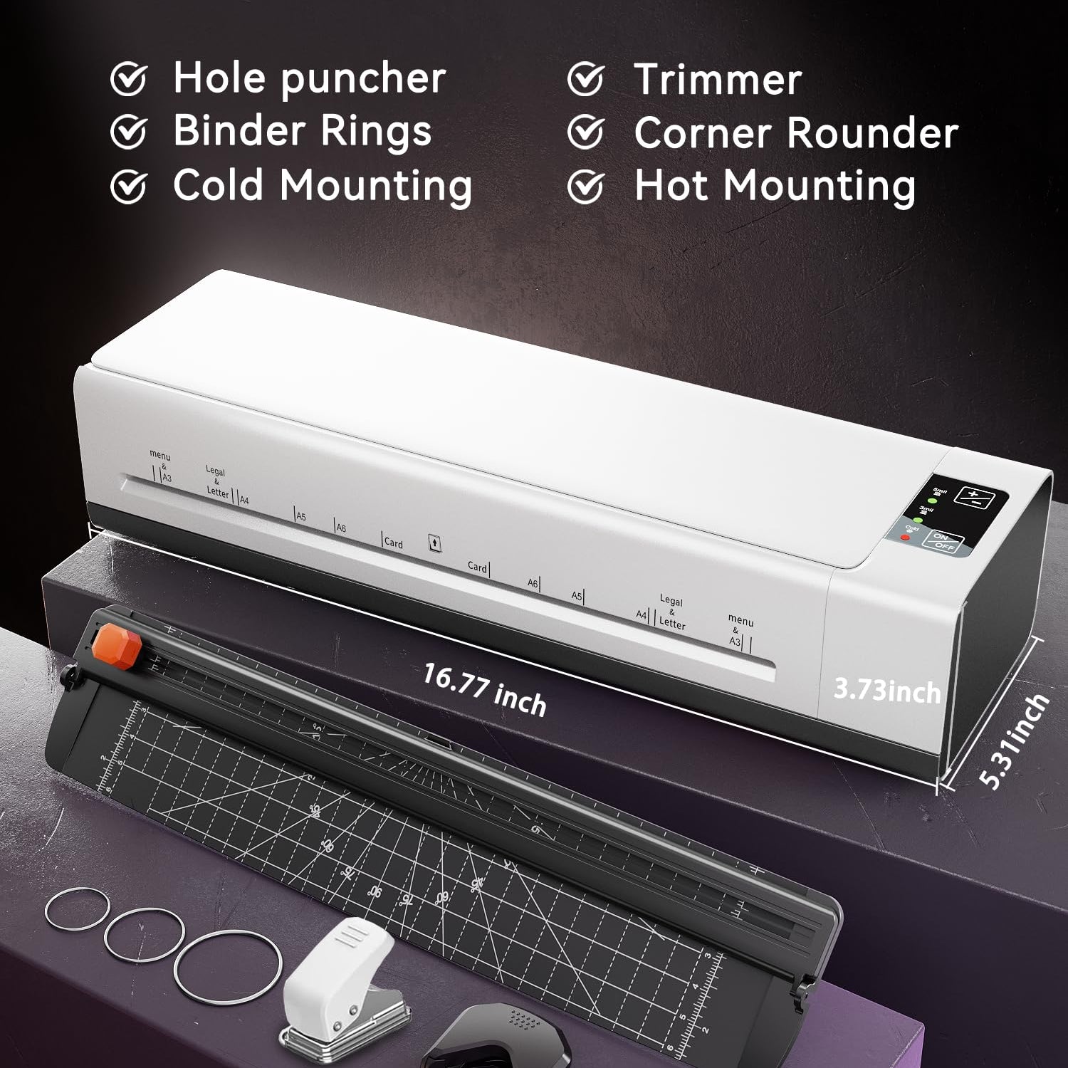 - 【 New Upgraded 9-in-1 Lamination Machine】: Crafted with high-molecular construction materials for unparalleled durability, our laminator comes in cool colors that make it a stylish addition to your studio. Dive into endless possibilities with our thermal laminator, which includes a built-in 1*paper cutter, 1*corner rounder, 1*hole punch, 3*binder rings, and laminating paper. Everything you need to kickstart your laminating journey is right here