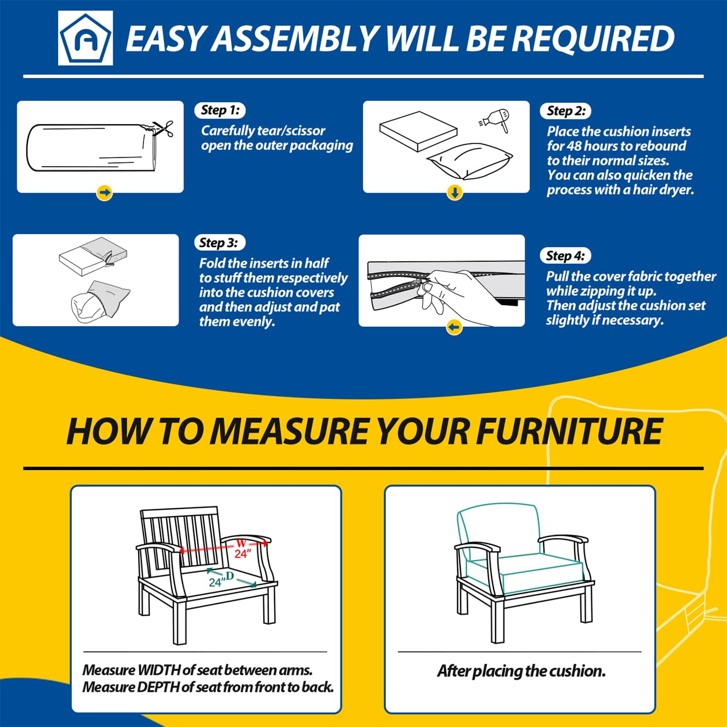 - About Size: Seat: 24L×24W×5H inches, Backrest: 24L×19H inches (dimensional tolerance: 0.5'' ). To get the right outdoor cushion, please measure the seat size of your outdoor furniture before ordering. Compressed and packed in a roll, the cushion foam inserts may come to you a bit bigger and thinner than their normal sizes after you unpack them. Please allow several days for them to rebound back or pluff them up faster by evenly moving a hair dryer around them for several minutes