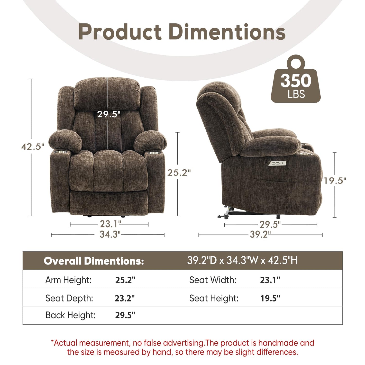 • 【Sturdy & Friendly Material】Our Lift Chair Recliner uses Upgraded Chenille Fabric, which is soft, anti-pilling, and easy to clean. The wooden frame is formaldehyde-free and meets CARB P2 standards. The high-quality metal frame and high-density sponge ensure durability and a weight capacity of 350 lbs