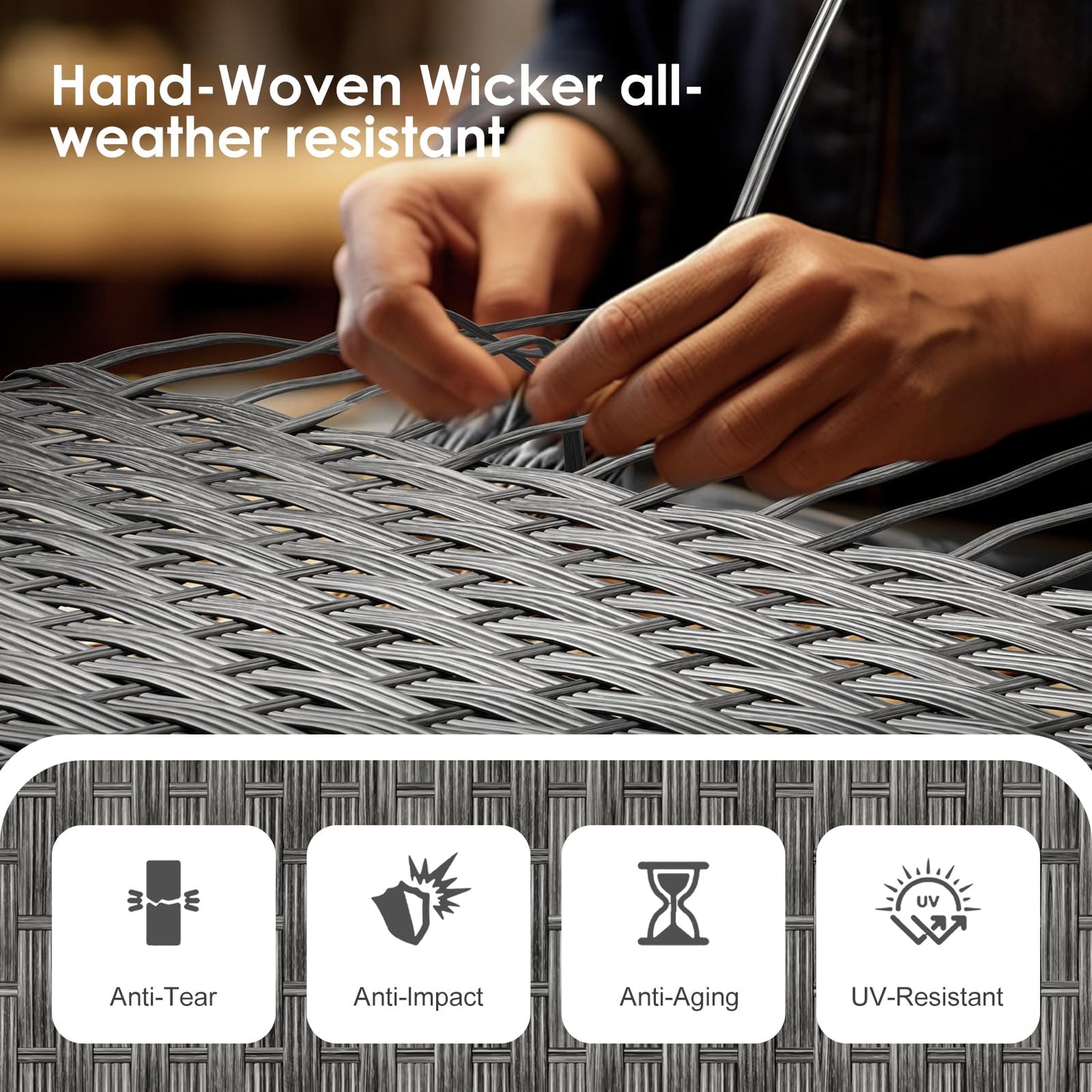 - đăSolid Frame & Premium Wicker, Sturdy and Nice LookingăBuilt with heavy-duty steel frame and premium wicker, ABCASA outdoor patio furniture set is durable and sturdy enough to resist years of sunshine or rain. Different from normal wicker, ours will never fade, crack or fracture.The rattan weave appearance of wood grain style, making it also a perfect decor to your outdoor spaces such as decks,poolside,front porches,sunroom