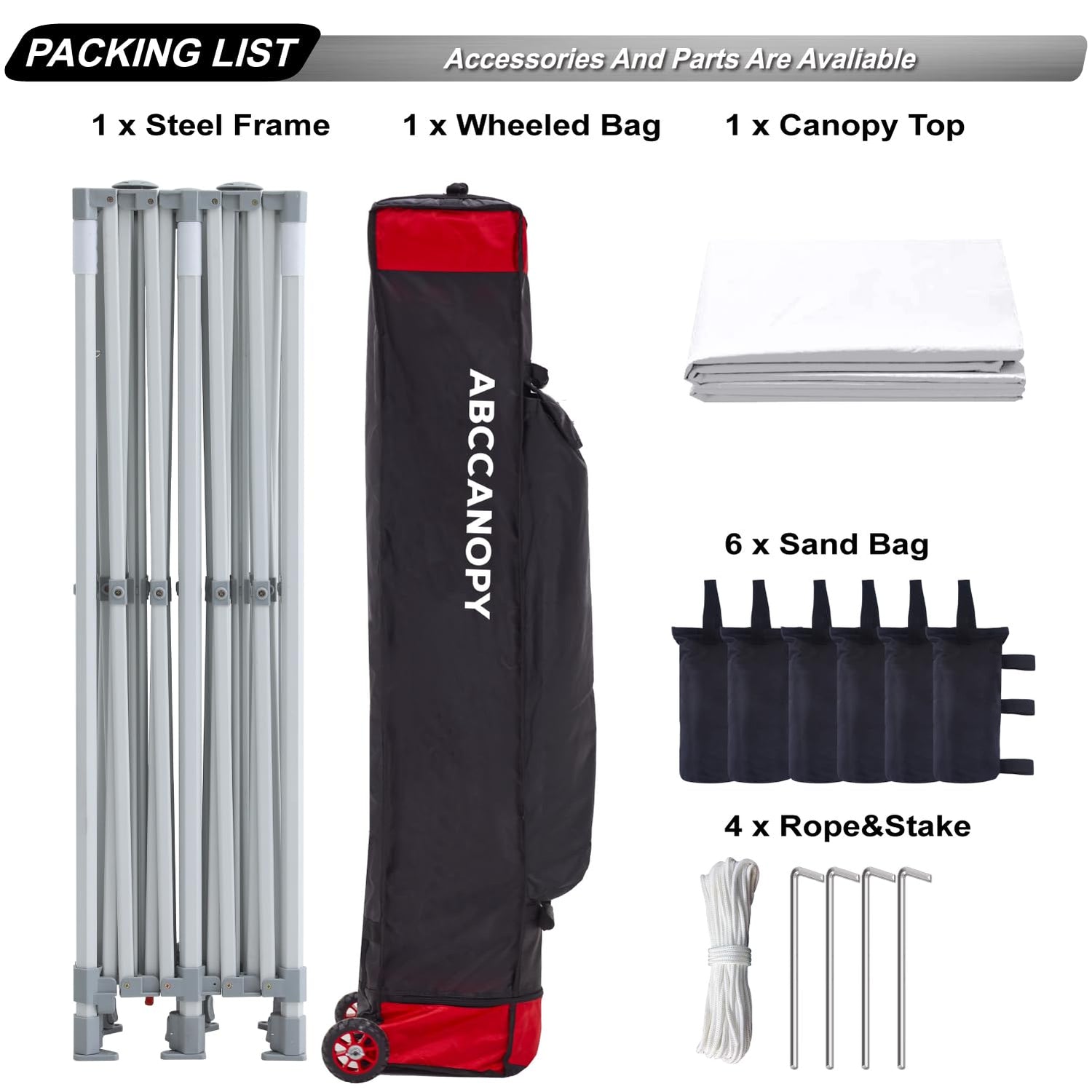 - [Packing and Warranty] Package includes premium pop up canopy frame + canopy tent top + roller bag + 4 weight bags+ 4 ropes+ 4 stakes. One year after-sale protection for frame, six months after-sale protection for fabrics and accessories. This is definitely most professional and durable pop up canopy. Satisfy all your professional need. If you have anything about our products, we are ready to help you.