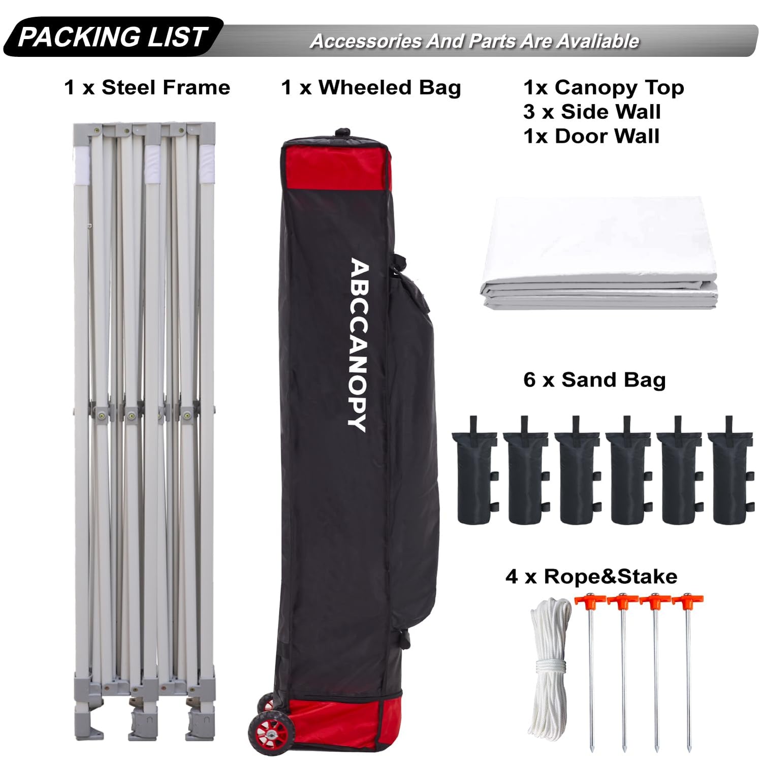 - WHAT IS INCLUDED - Commercial 10'x20' Pop Up Canopy Frame, 10'x20' Canopy Top Cover, 4 Removable Side Walls, 2 Door Wall. Roller Bag,6 Weight Bags, 4 stake and ropes.The upgraded style roller bag is more rugged and durable. One year after-sale protection for frame, six months after-sale protection for fabrics and accessories.