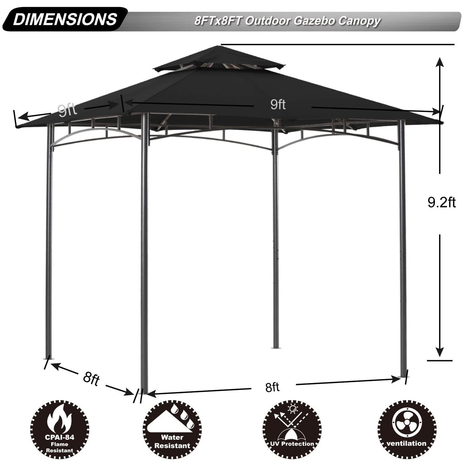 - ★Large Shade Area: This outdoor patio gazebo is 8'L x 8'W x 9.2'H, providing 64 square feet of coverage, enough for 4-6 people. Designed with expanded awning on both 4 sides, the gazebo provides an extra cool shade. Please measure your platform and furniture dimensions before purchasing.