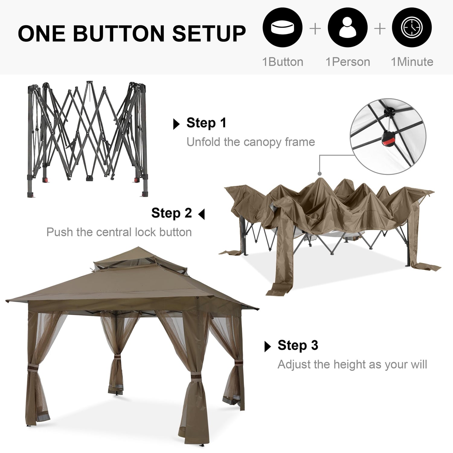 - EASY SET-UP GAZEBO: The latest ONE PUSH central lock technology design enables ONE PERSON to SET UP in ONE MINUTE by ONE BUTTON. This pop-up gazebo includes a convenient carry bag, making it an excellent portable and quick shade coverage solution during sports events, camping, trips, and backyard gatherings.