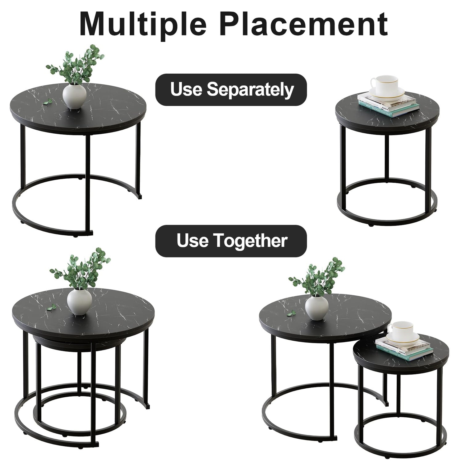 - ✔NESTING TABLE The unique semi circular legs and circular tabletop of the large table allow our coffee table to be placed separately or stacked. You can place this side table in any position while also saving your space.
