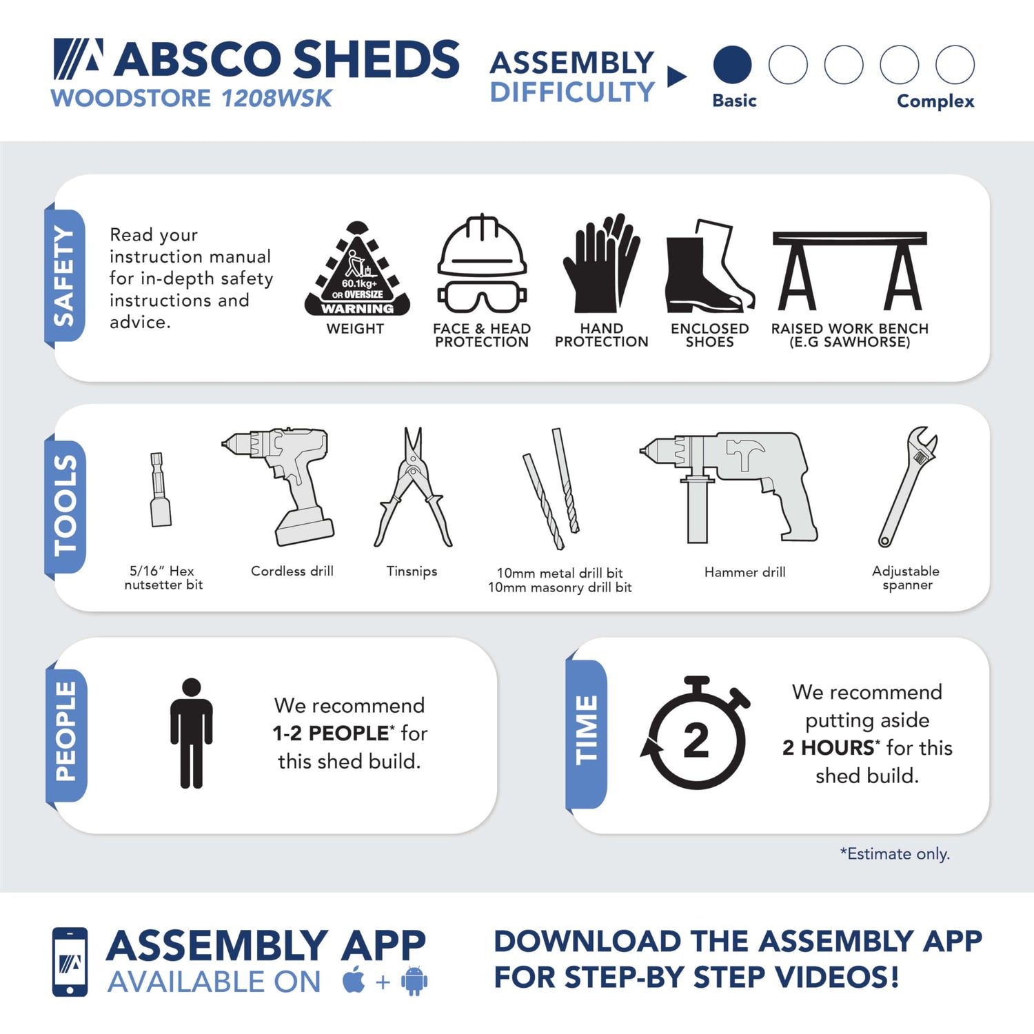 - EFFICIENT DIY ASSEMBLY: Patented SNAPTiTE assembly system, pre-drilled holes and labeled parts allow for faster assembly and 75% less screws. Step-by-step assembly videos and instruction manuals are available through the ABSCO Sheds App