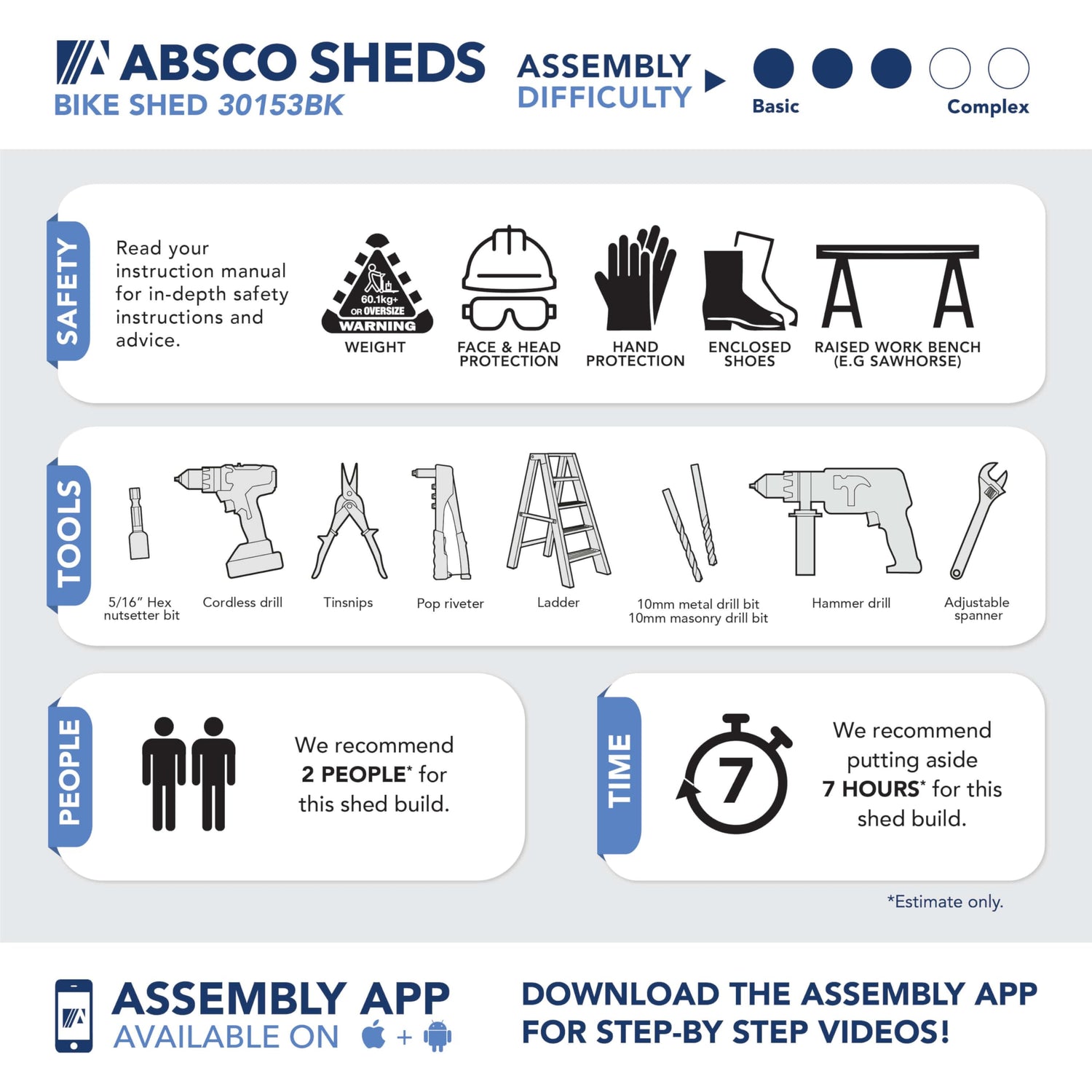 - EFFICIENT DIY ASSEMBLY: Patented SNAPTiTE assembly system, pre-drilled holes and labeled parts allow for faster assembly and 75% less screws. Step-by-step assembly videos and instruction manuals are available through the ABSCO Sheds App