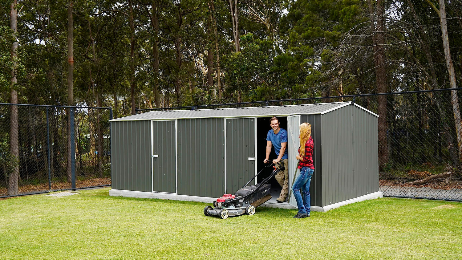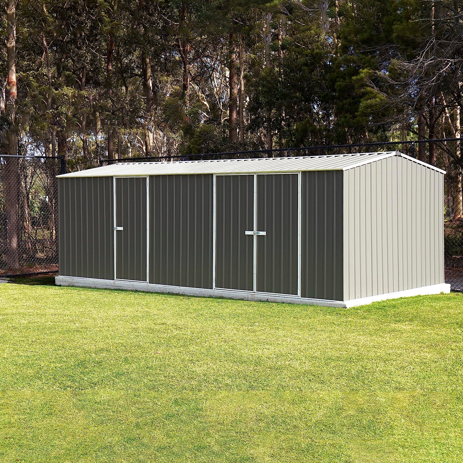 Details: The 20 x 10 ft Absco workshop shed is one of our largest sheds and comes with double doors and a single access side door. This shed is a great option for those with a large yard and those who require somewhere to store larger equipment. It is also spacious enough to house upright or overhead storage and can comfortably fit a work bench as well. The Woodland Gray color is modern and will complement any outdoor setting. Absco's sheds come with the patented SNAPTiTE assembly system that saves time in assembly with less screws required. Our steel panels have rolled edges for safety. SNAPTITE also provides structure and rigidity to your shed without the need for additional internal bracing, when anchored correctly to a concrete slab. Flooring is not included. All parts come labelled and are pre-cut to size, with step-by-step instructional videos available on the Absco Sheds App.