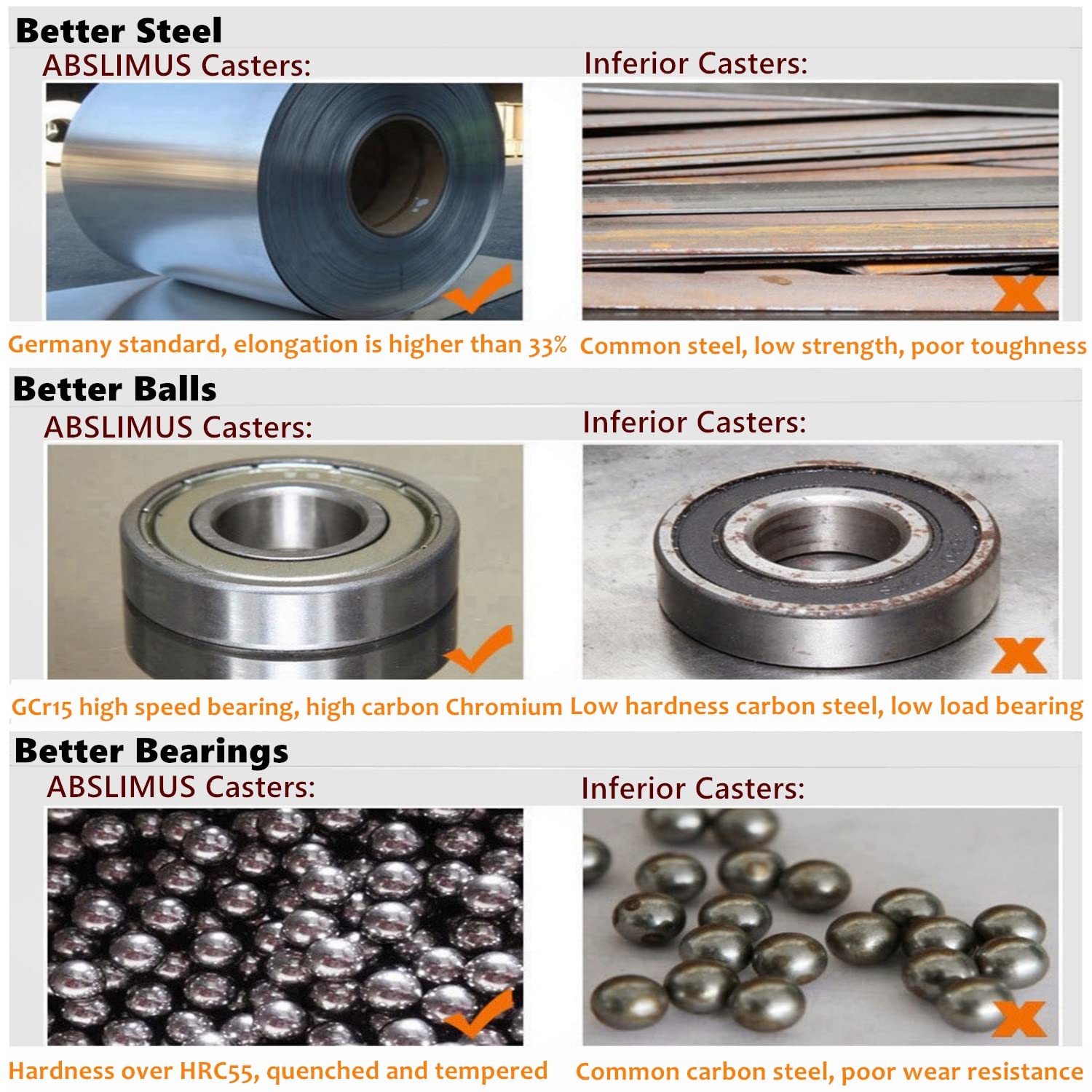 - 💎【Upgraded Materials and Processing 】- Our Upgraded Casters feature a thickened universal steel column, reinforced plating, and double support bearings for unparalleled stability and durability. High-strength stainless steel electrophoresis stand ensures long-lasting performance, while mute steel ball ensures smooth, quiet rolling. Superior polyurethane casters offer exceptional abrasion resistance, and no-drag marks, enhancing the overall impact resistance of the casters. Load Capacity-800lbs.